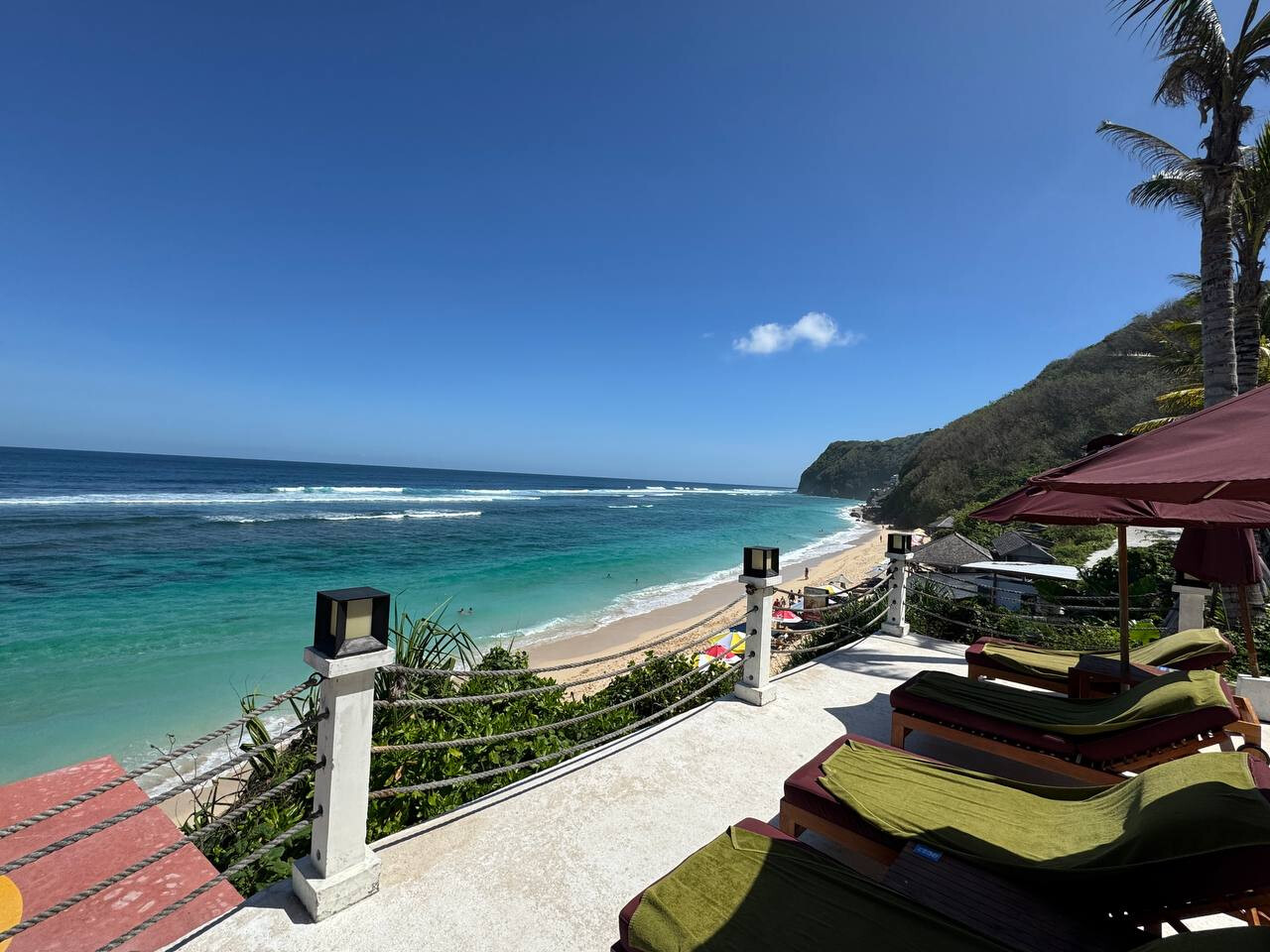 Неплохое кафе Nelayan Bali, где можно воспользоваться лежаком, нужно только заказать что-нибудь из меню. Пляж у кафе расположен в небольшой бухте с газебо. Вода в океане обычно чистая и спокойная, за исключением небольших водорослей.