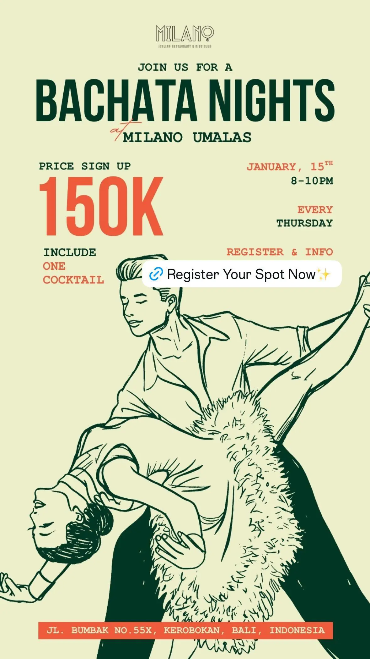 Без пафоса, без напряжения — только чистое веселье и танцы до утра.Бонус: маргариты по 100 000 IDR всю ночь.