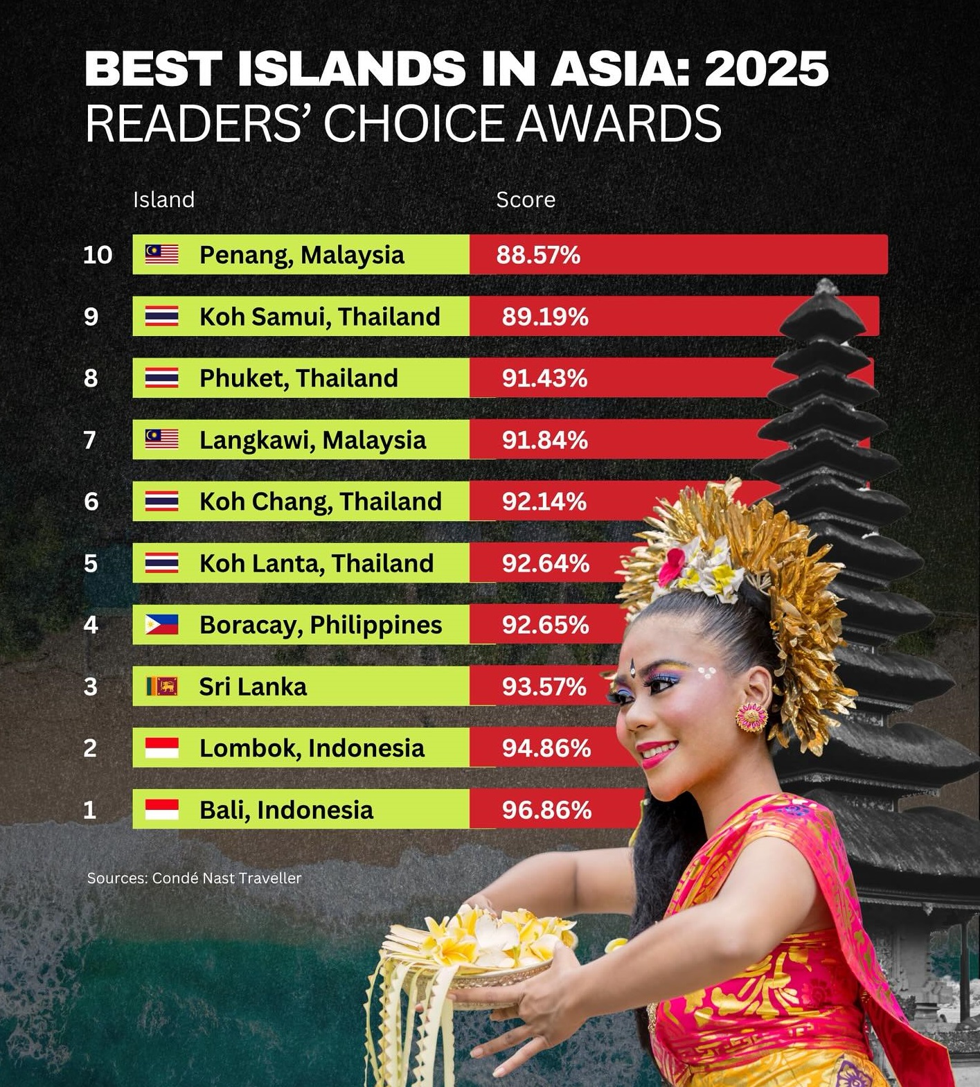 Бали вновь оказался в центре мирового внимания: остров занял первое место в списке лучших островов Азии 2025 года по версии престижной премии Readers' Choice Awards журнала Condé Nast Traveler.