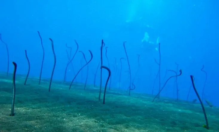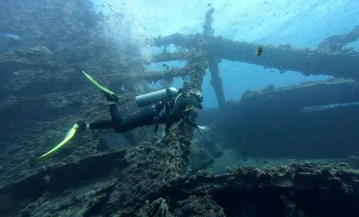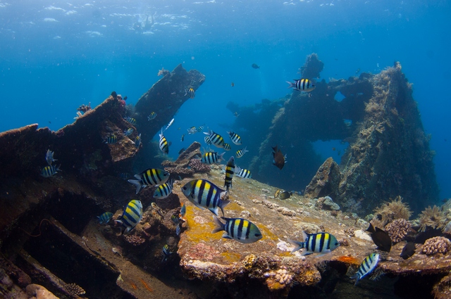 - Шикарный коралловый риф, разросшийся вокруг затонувшего корабля, который лежит на глубинах от 4 до 30 метров на песчаном откосе. Множество крупных рыб, горгонарии, косяки тунца, иногда, черепахи посещают корабль.