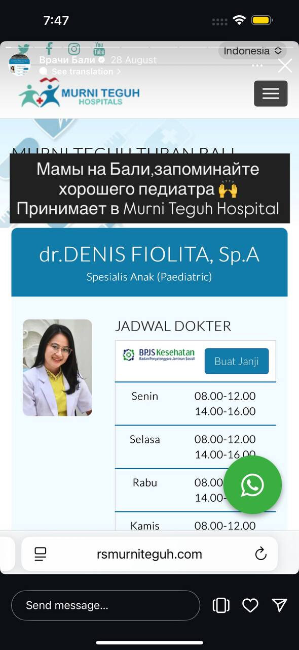 “Больница с лучшим обслуживанием, когда мой ребенок заболел, когда мы отправились в тур из Сурабаи на Бали.. обработка была очень быстрой, сразу же попросили BPJS, вообще не заплатили.. мой ребенок смог продолжить тур.. врачи и медсестры тоже были очень дружелюбны, добры и кропотливы.Спасибо за всю доброту... дальнейших успехов в больнице Ганеша🙏🙏!”