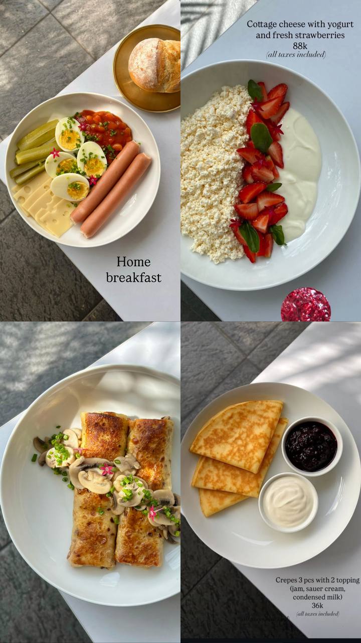 •Завтраки: американский завтрак с яйцами, беконом и тостами, сырники, французские тосты с медом и фруктами.