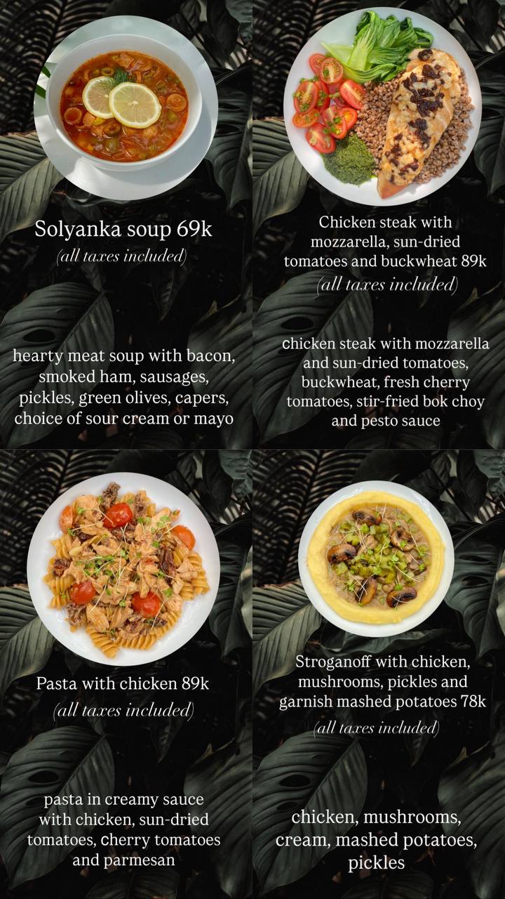 🥩 Основные блюда: стейки из курицы и лосося, паста, бефстроганов.
