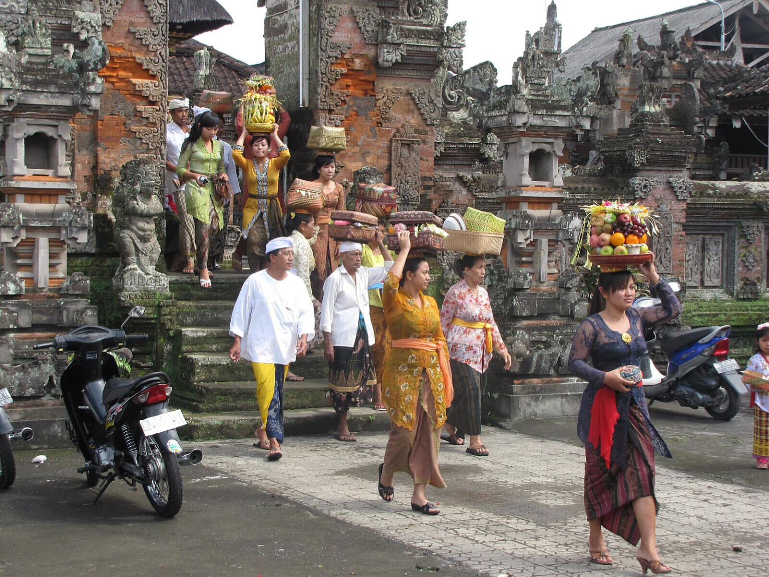 Утром балийцы надевают традиционную одежду: кайн (саронг), селеданг (пояс), женщины — кружевные кабайи. Семьи направляются в храмы для молитвы, очищения и благодарения.Подношения ставятся в семейных святилищах, у ворот домов, в храмовых комплексах, а также у пенджоров. Это время, когда дома становятся святилищами, а улицы — ярким символом веры и культурной гордости.