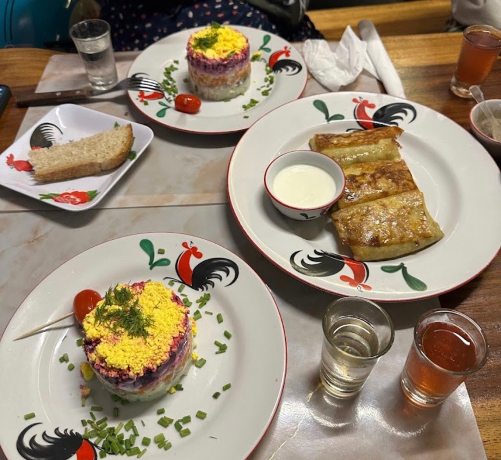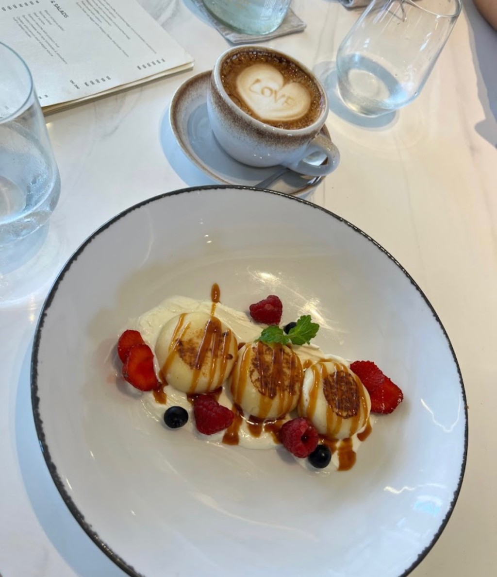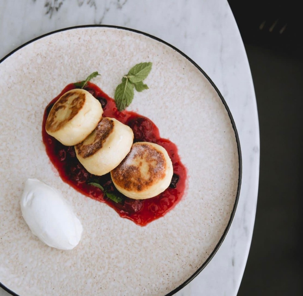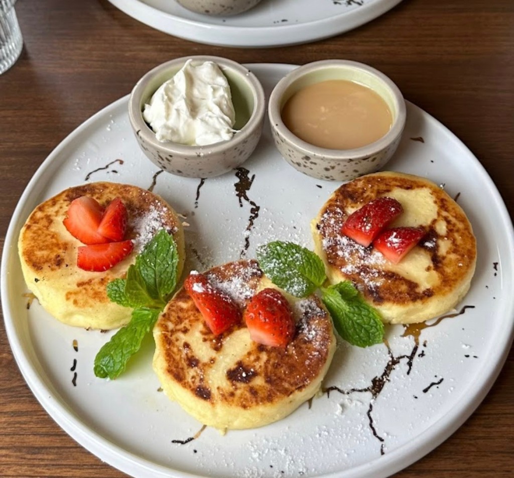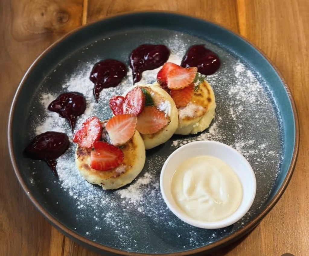 В данном заведении вы сможете попробовать сладкие сырники с выраженным вкусом ванили. В составе идеальное соотношение творога и теста. Подаются с клубничным вареньем и свежими ягодами. Все выглядит очень красиво и аппетитно. Также в меню есть вегетарианские блюда.