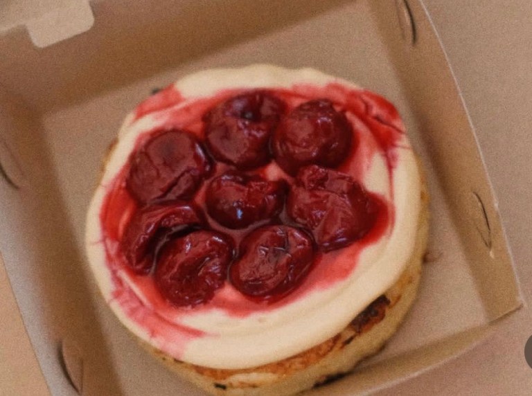 Порция состоит из одного большого сырника. Очень вкусный, но для идеала не хватило сливочного вкуса в составе. Творог зернистый, консистенция приятная, есть корочка, баланс вкусов шикарный. Подается с вареньем из черешни - это круто!