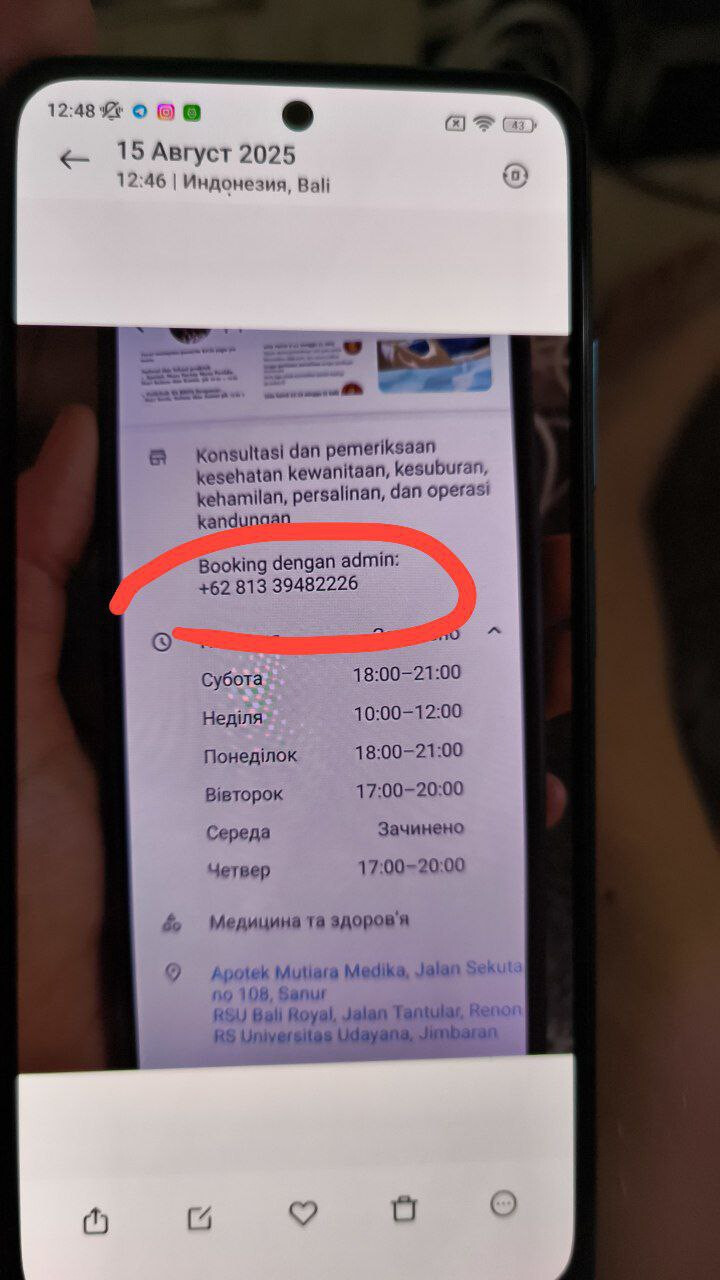 Стоимость приема в клинике от 400к рупий. Запись по телефону +62 813-3755-0555 (Whatsapp).