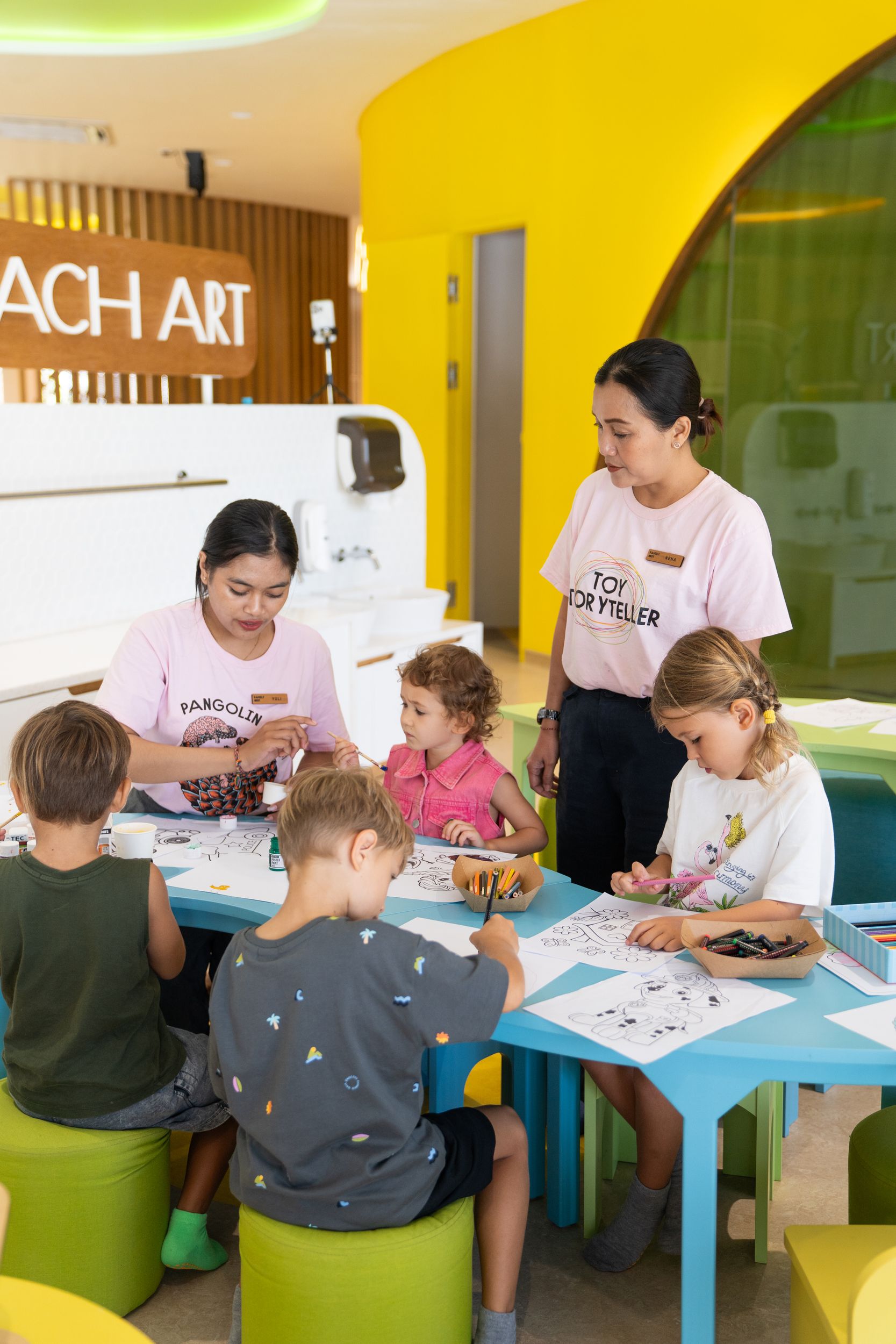Заботливые Play Buddies сопровождают малышей в играх и мастер-классах: традиционные балийские игры, поделки из переработанных материалов, танцы, фейс-пейтинг.