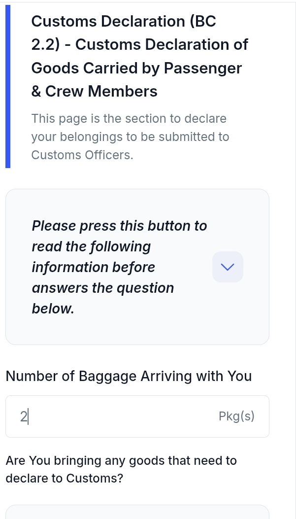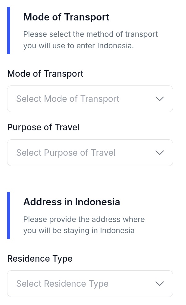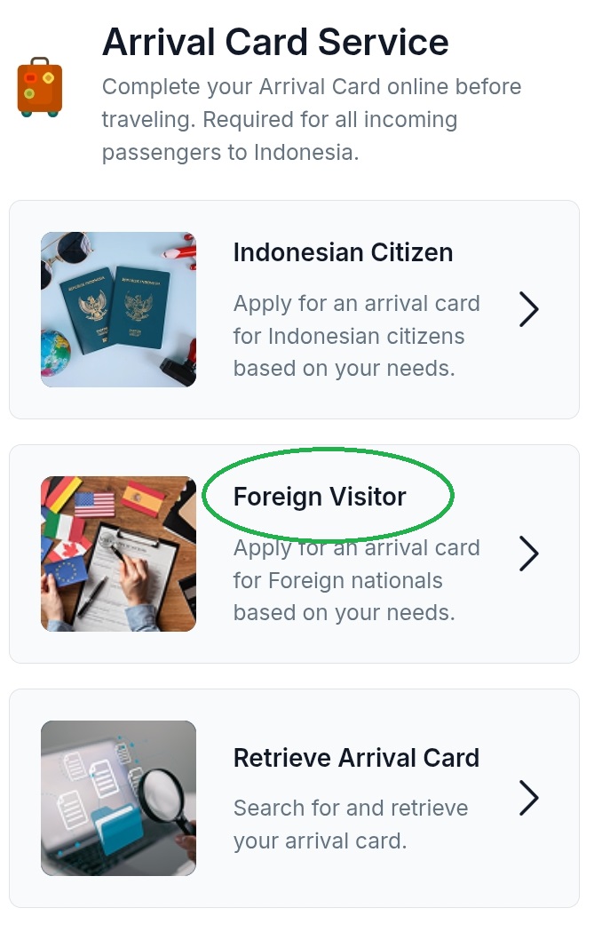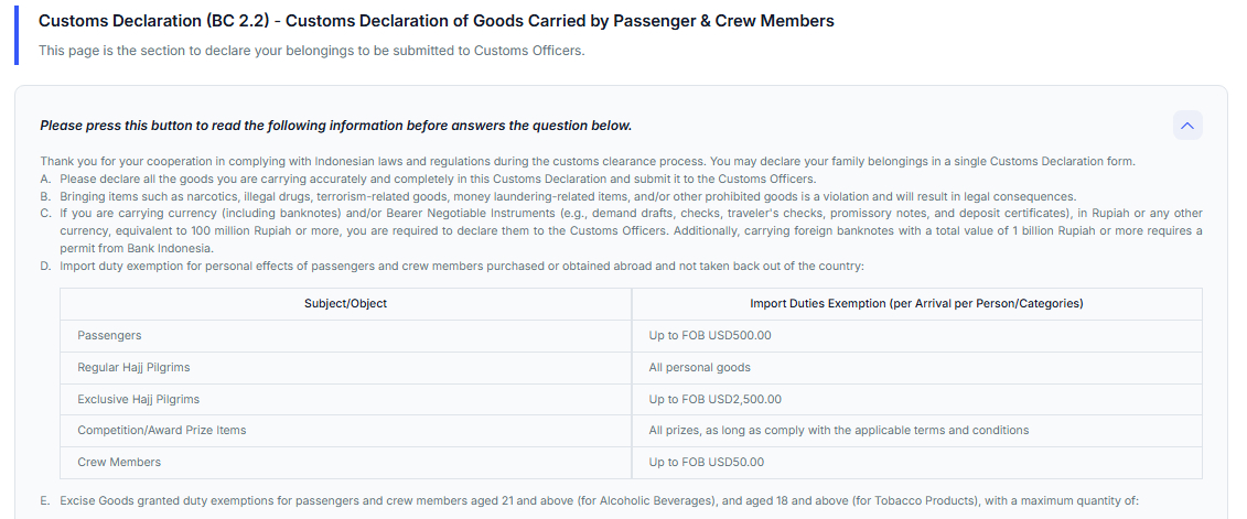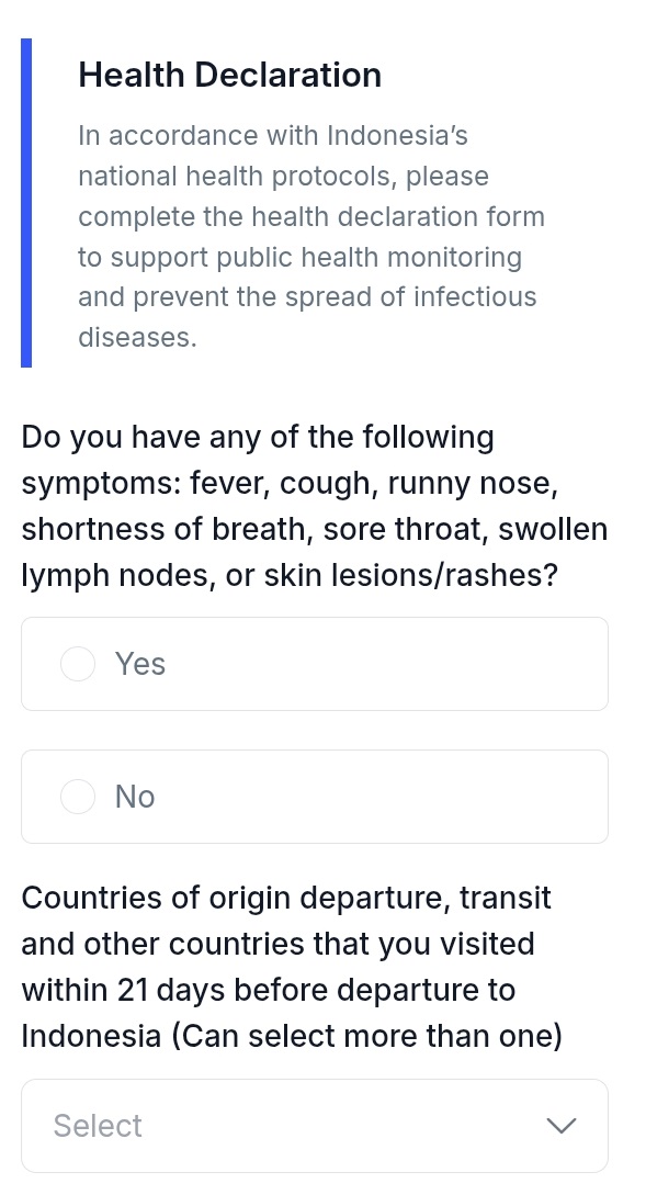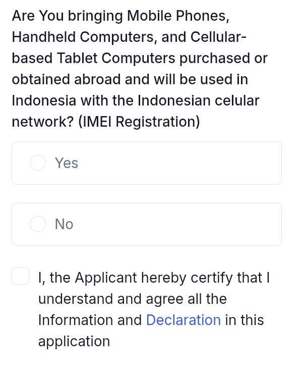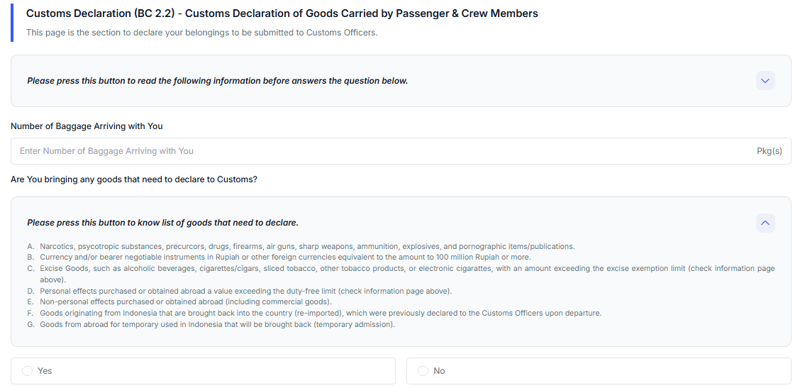 Система для прибывающих через аэропорты Индонезии, а также по морю, доступна на трех языках - индонезийском, английском и китайском. Заполнить анкету можно не ранее, чем за 72 часа до планируемого прибытия. Если вы заполняете уже на месте, до прохождения миграционного контроля, то в случае затруднений можно обратиться за помощью к персоналу аэропорта. Если у вас нет смартфона/ноутбука/планшета, в аэропорту есть компьютеры с доступом в интернет, которыми можно воспользоваться. Перед началом заполнения подготовьте: действующий паспорт, билет (в обе стороны, если вы летите отдыхать), данные отеля или адрес проживания в Индонезии.