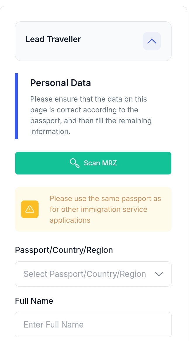 Нажмите зеленую кнопку "Scan MRZ", отсканируйте машиночитаемую зону вашего паспорта (нижние строки с символами). При заполнении используйте тот же паспорт, что и для покупки билетов и других иммиграционных процедур. Система автоматически заполнит основные данные в анкету. Более надежный способ - заполнить информацию вручную.