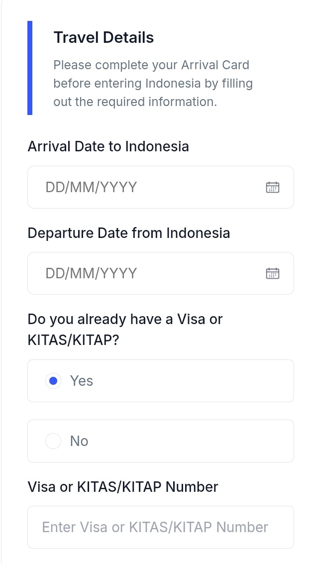 Вводим планируемые даты прибытия (Arrival date) и вылета (Departure date) из Индонезии. Обратите внимание, если ваш рейс прибывает на следующий день после вылета. Указываем номер визы или КИТАС/КИТАП, если таковые имеются.