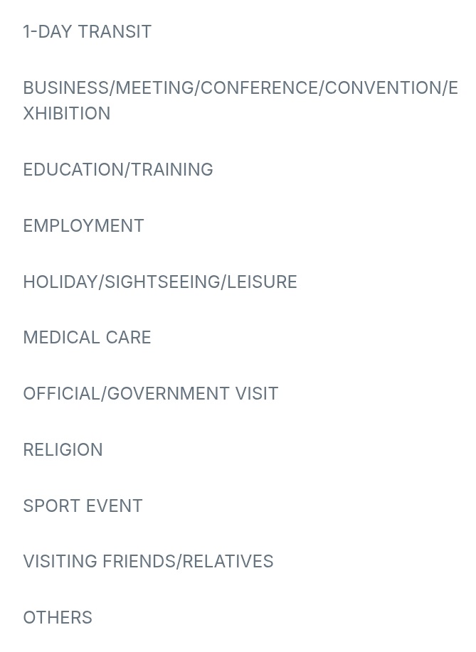 Цель визита (Purpose of visit) - если вы едете на отдых, то это HOLIDAY / SIGHTSEEING / LEISURE
