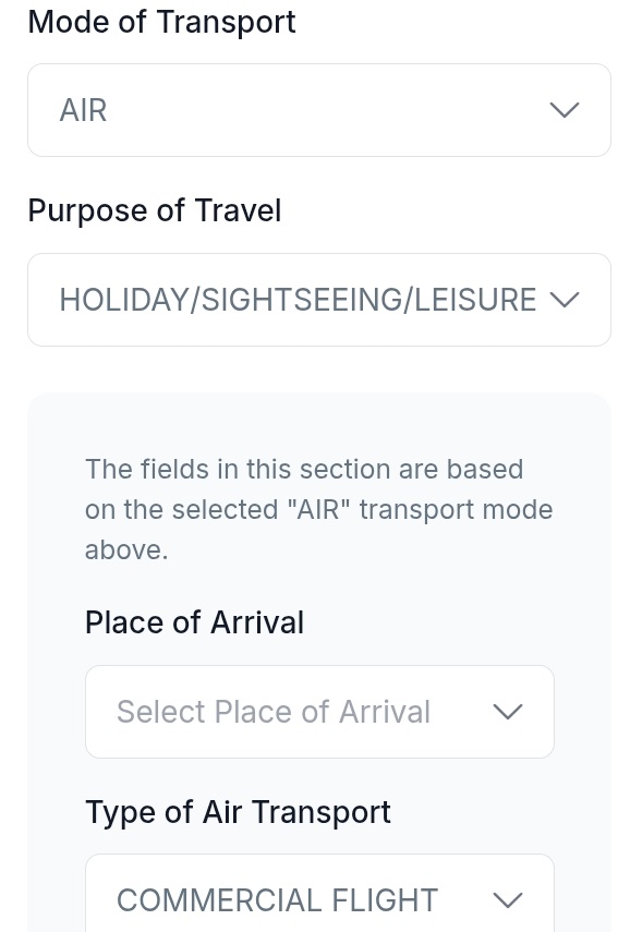 Анкета состоит из четырех разделов: личная информация (Personal information), детали поездки (Travel Details), вид транспорта и адрес (Mode of transportation & address), декларация (Declaration).