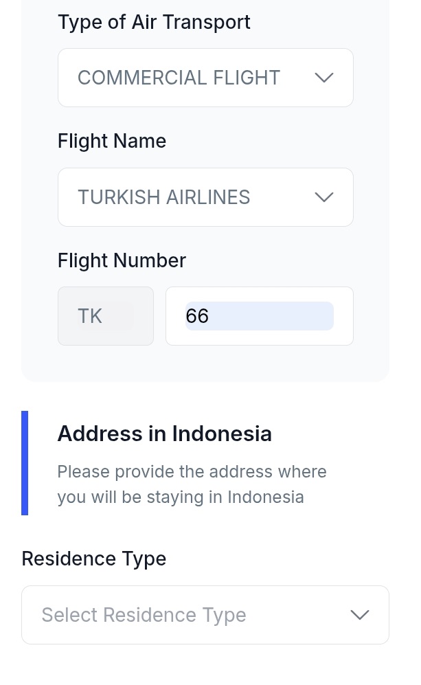 Номер рейса (Flight number) - если летите с пересадкой, указывайте именно тот рейс, который прибывает из третьей страны в Индонезию.