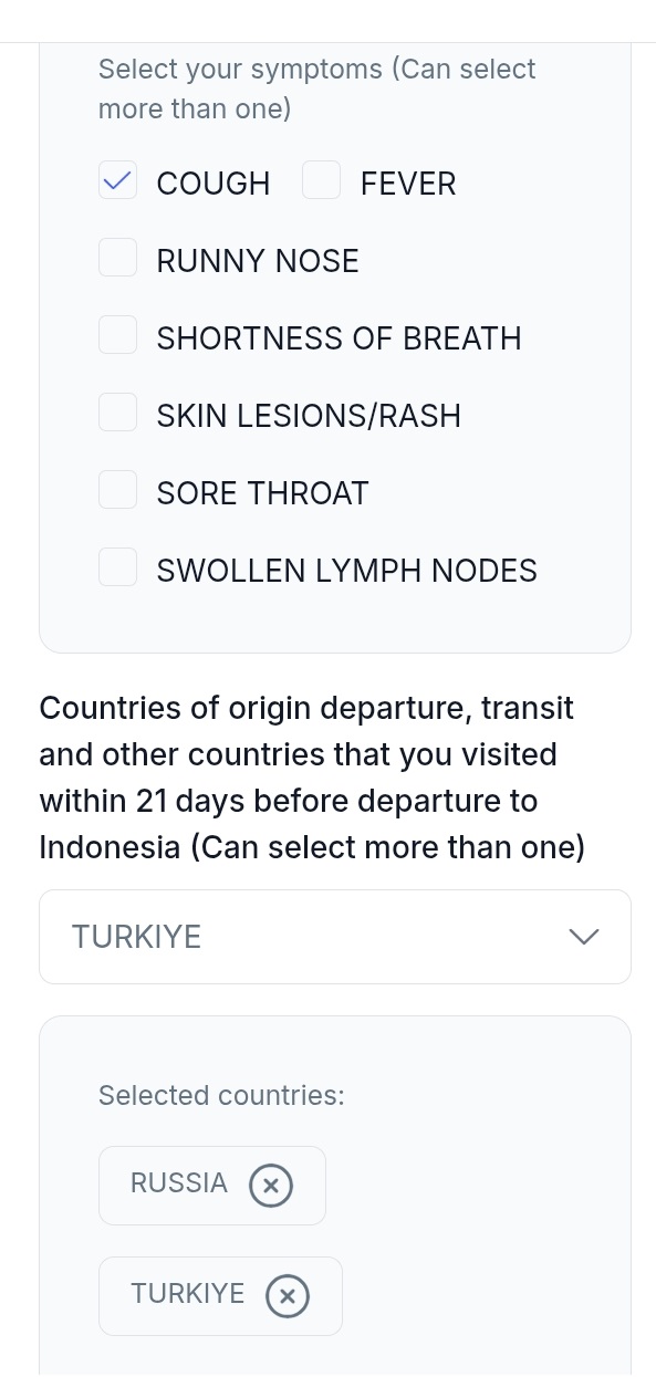 Если всё в порядке, то отмечаем “No”. Если есть какие-либо симптомы: кашель (cough), лихорадка (fever), насморк (running nose), затрудненное дыхание (shortness of breath), поражения кожи (skin leisons/rush), больное горло (sore throat), отечные лимфоузлы (swallen limph nodes), то ставим “Yes” и отмечаем их галочкой. Перечисляем страны, в которых были за 21 день до прибытия в Индонезию.