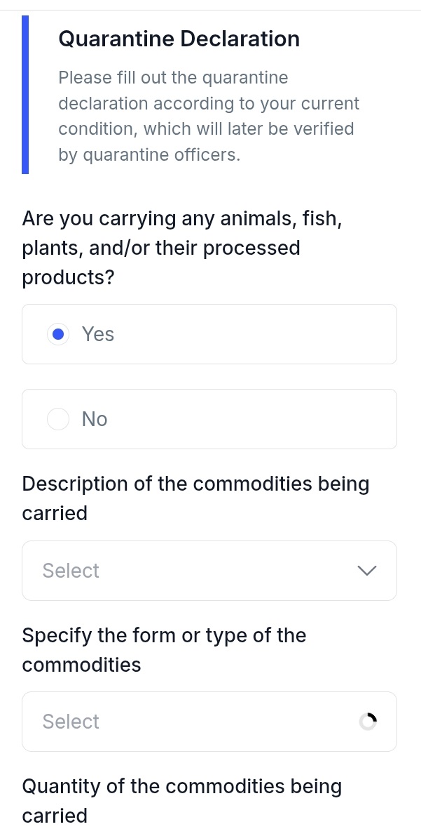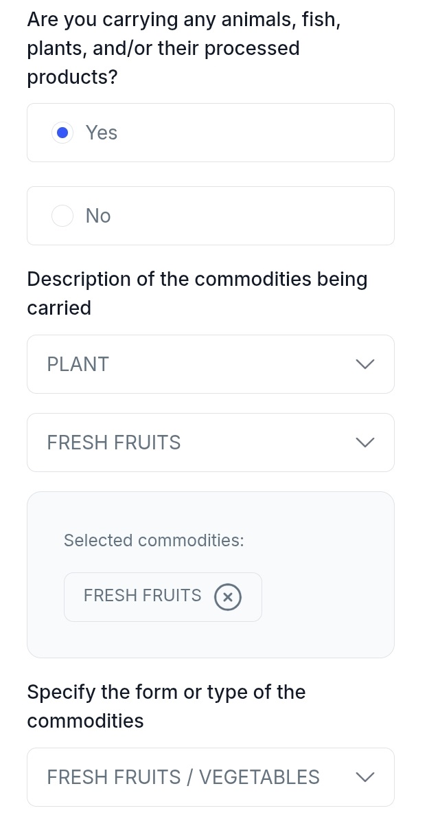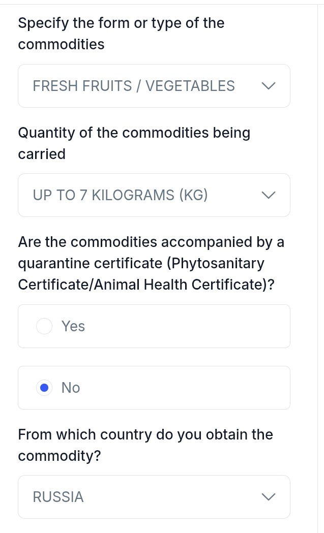 Декларируем товары, подлежащие карантинному контролю, если таковые имеются: растения, животные и их части, в том числе свежие или сушеные фрукты и овощи, семена, саженцы. В некоторых случаях необходим фитосанитарный сертификат или сертификат здоровья животного.