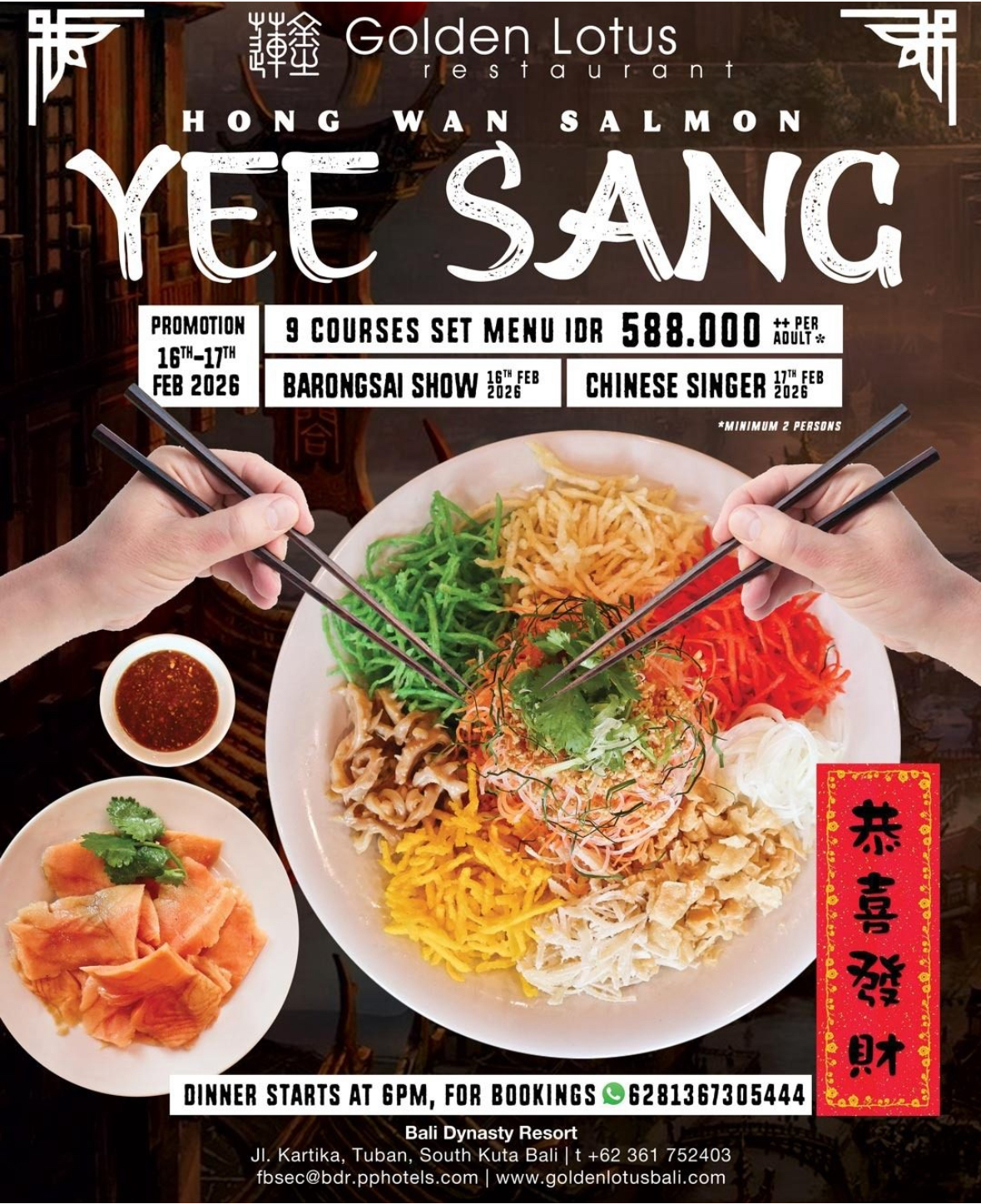Golden Lotus в Bali Dynasty Resort к Китайскому Новому году подготовили праздничный ужин с традиционным сет-меню из девяти подач. Вечер посвящён классическим новогодним символам — удаче, достатку и семейным встречам, а одним из главных элементов станет салат Yee Sang с лососем, который по традиции перемешивают всей компанией на удачу.