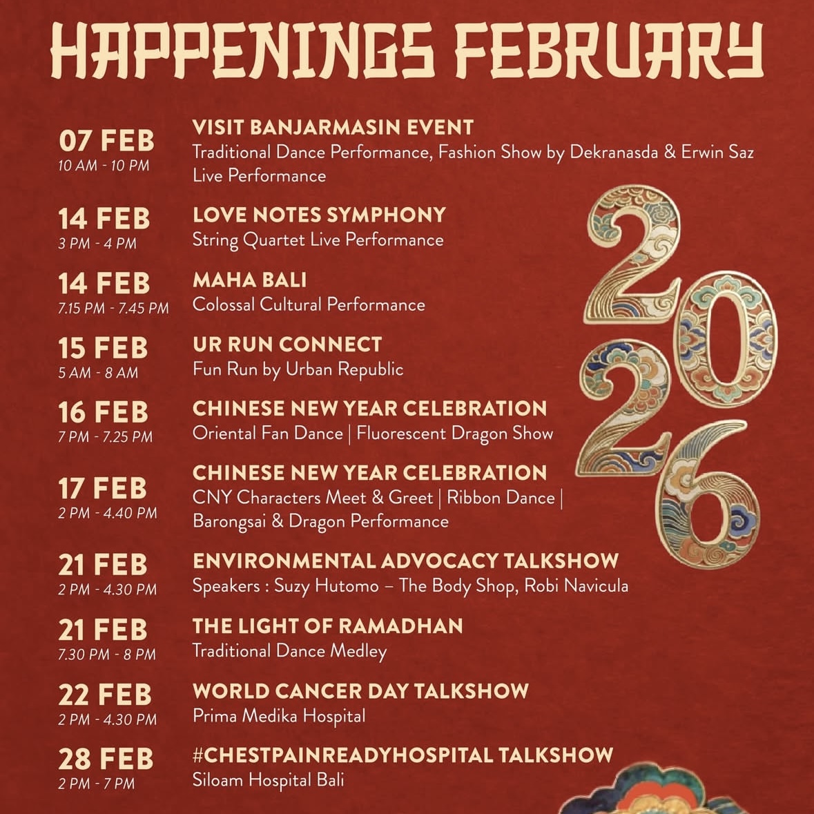 В Bali Collection (Нуса-Дуа) с 15 по 17 февраля 2026 пройдёт фестиваль Китайского Нового года. В программе — балийские танцы, выступления Баронгсай (танец льва), барабанное шоу, живая музыка и DJ, а 16 февраля запланированы фейерверки и основные праздничные выступления. Это открытое для всех событие с атмосферой ярмарки и уличного праздника, где можно погулять, посмотреть шоу и провести вечер в праздничной обстановке.