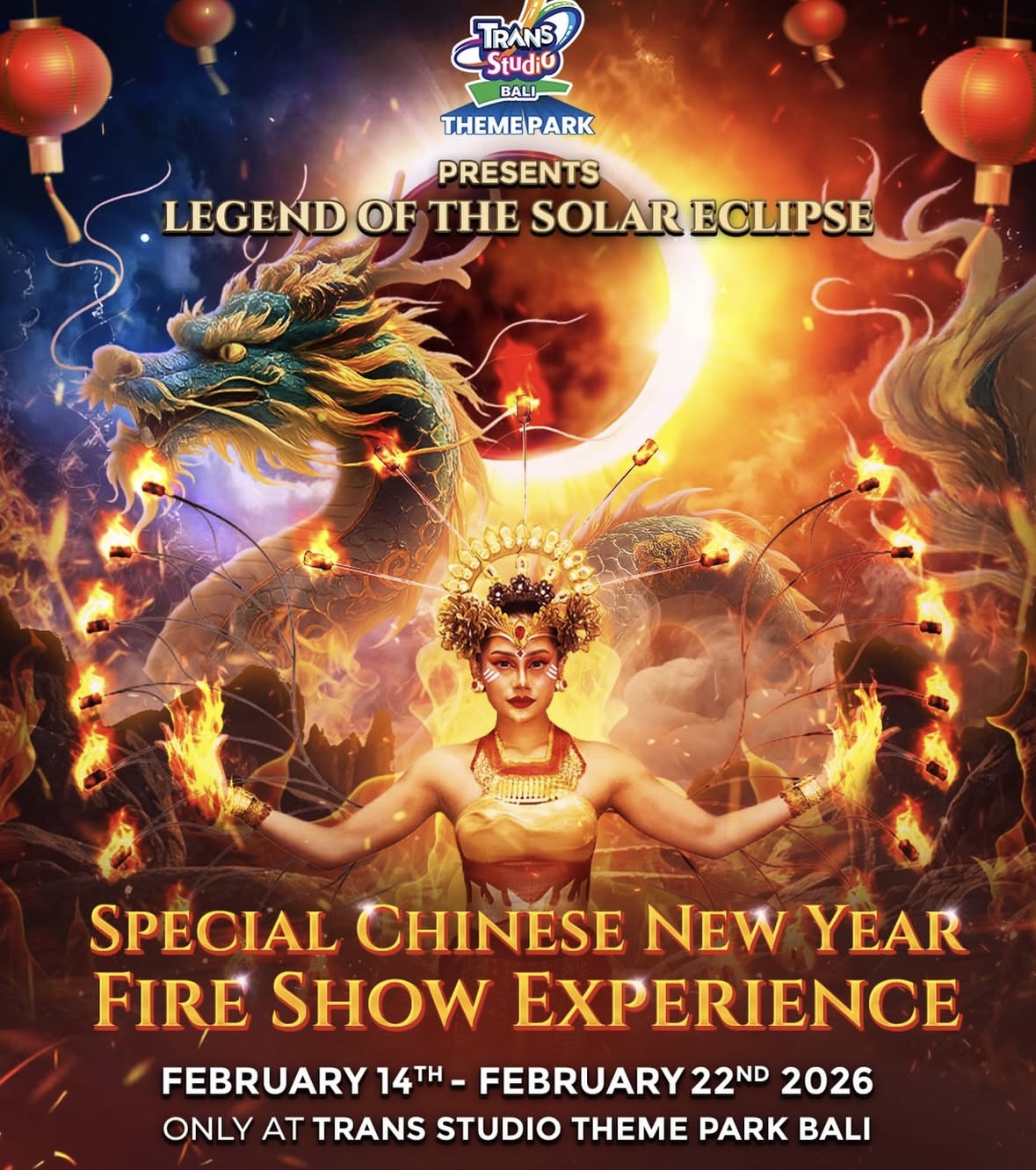 С 14 по 22 февраля — специальное огненное шоу “Legend of the Solar Eclipse”. Это 15-минутное представление с огненной хореографией и ритуальными танцами, вдохновлённое мифологией и символикой обновления, приуроченное к Китайскому Новому году.