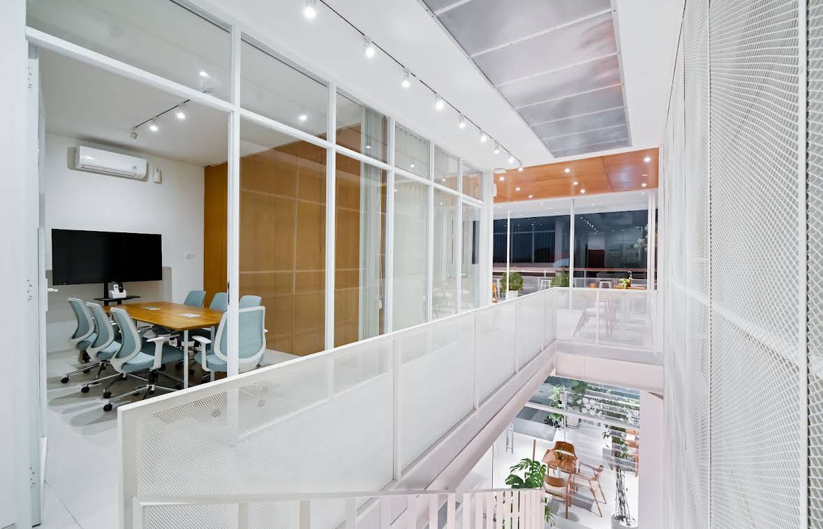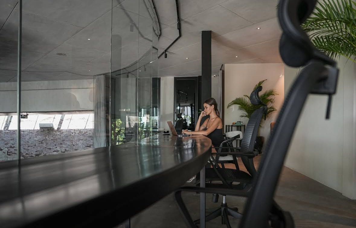 Открытые пространства, террасы, много воздуха и зелени. Внутри — кондиционируемые тихие комнаты и удобные рабочие места. Атмосфера располагает к концентрации и размеренному рабочему ритму.