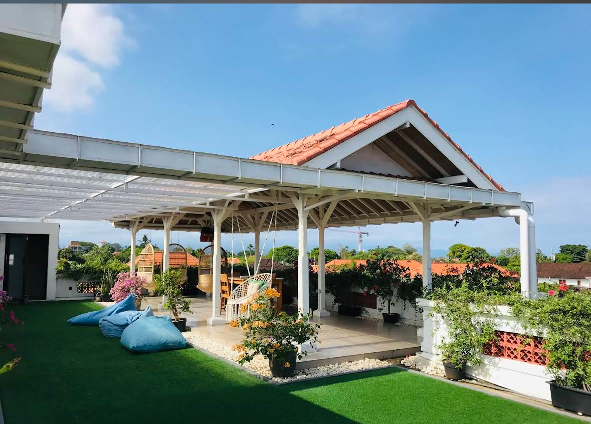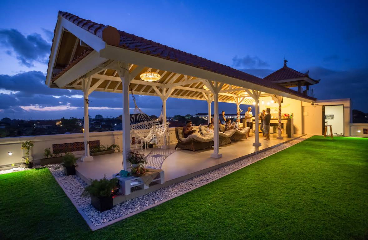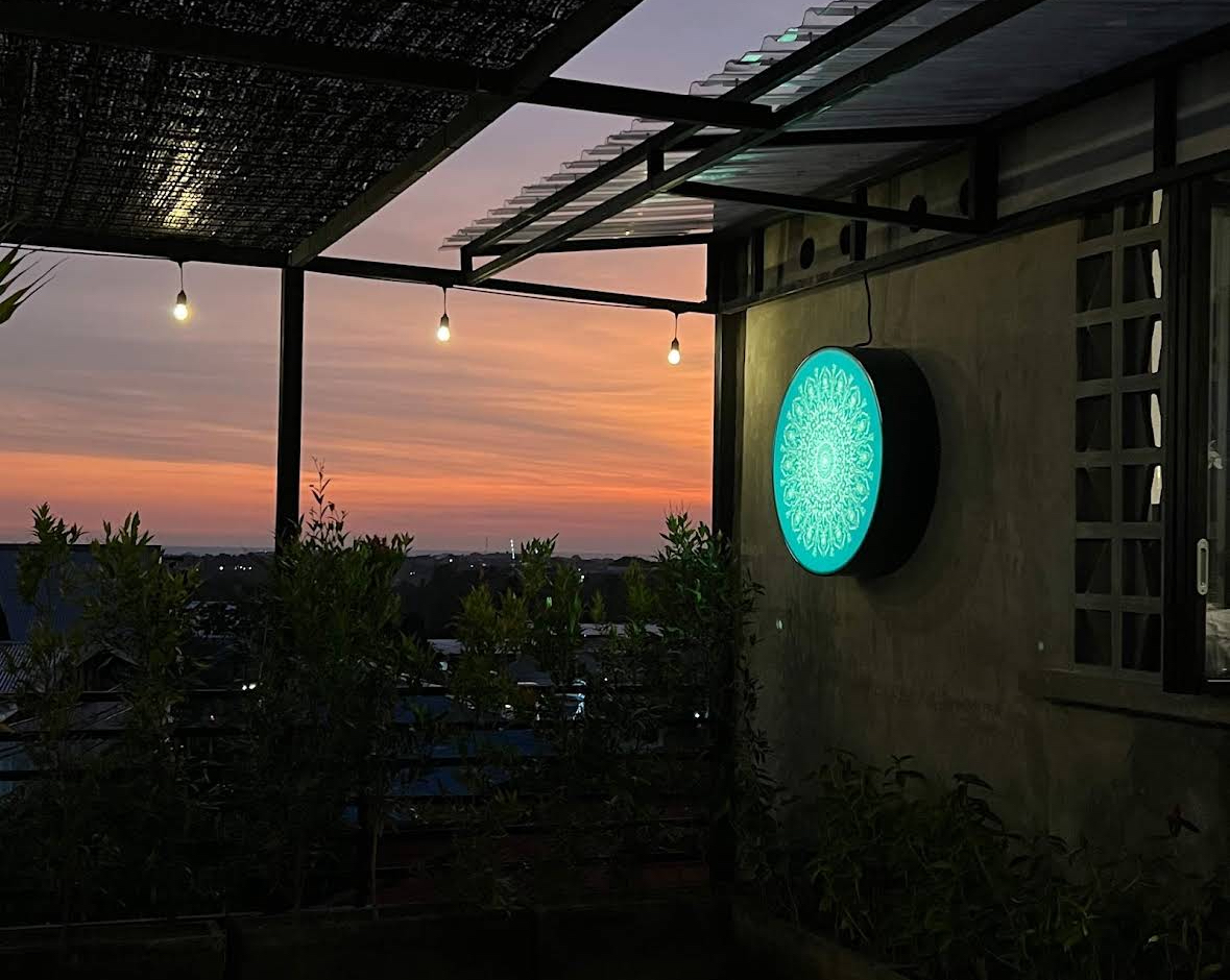 Терраса с панорамой 360° — виды на Санур, вулканы и острова. Подходит для созвонов, закатов, медитаций и встреч.