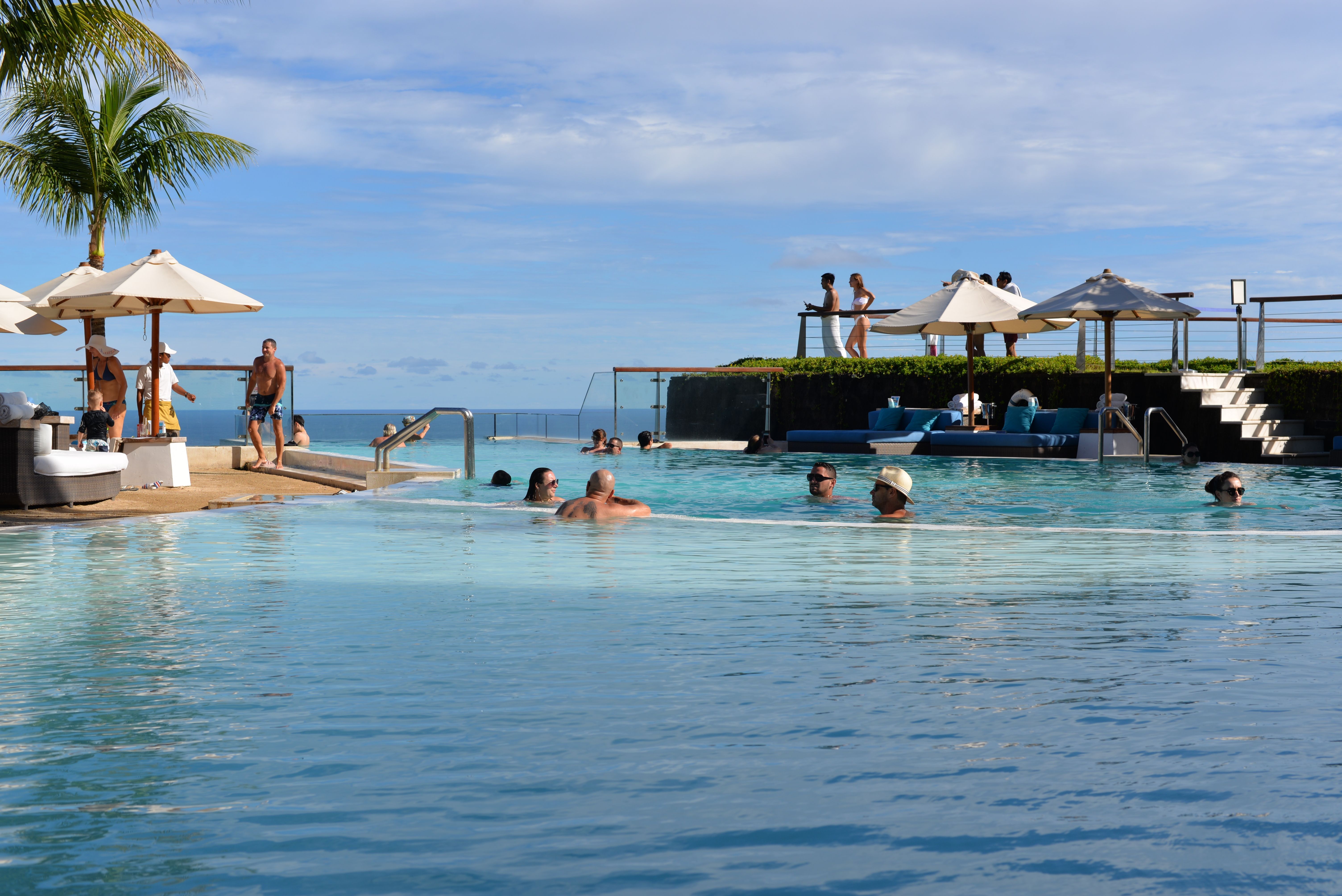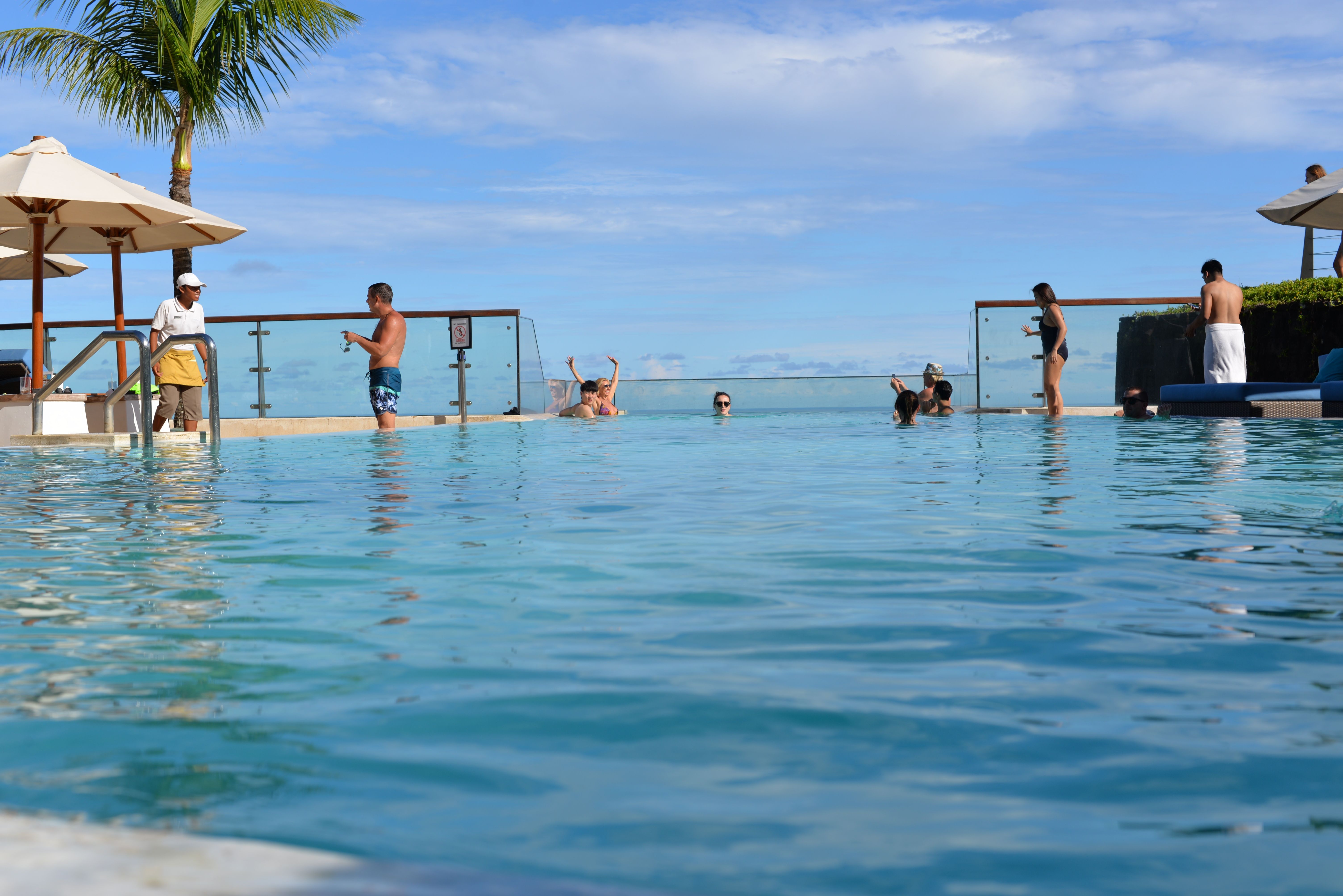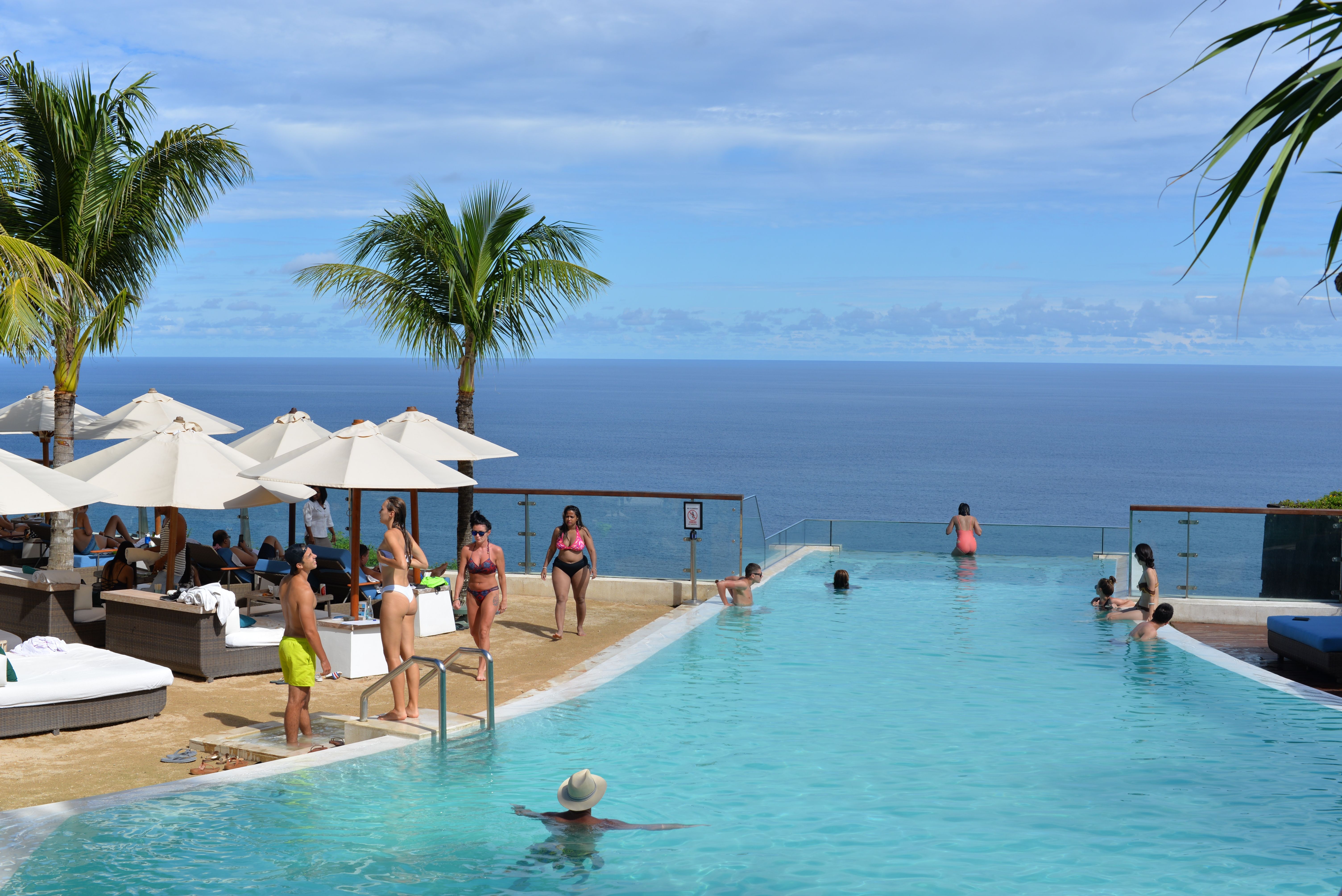 В общей сложности тут три бара, один инфинити бассейн, танцпол, четыре зоны для отдыха: столики под крышей, пляжные кровати, столики с баром на террасе.