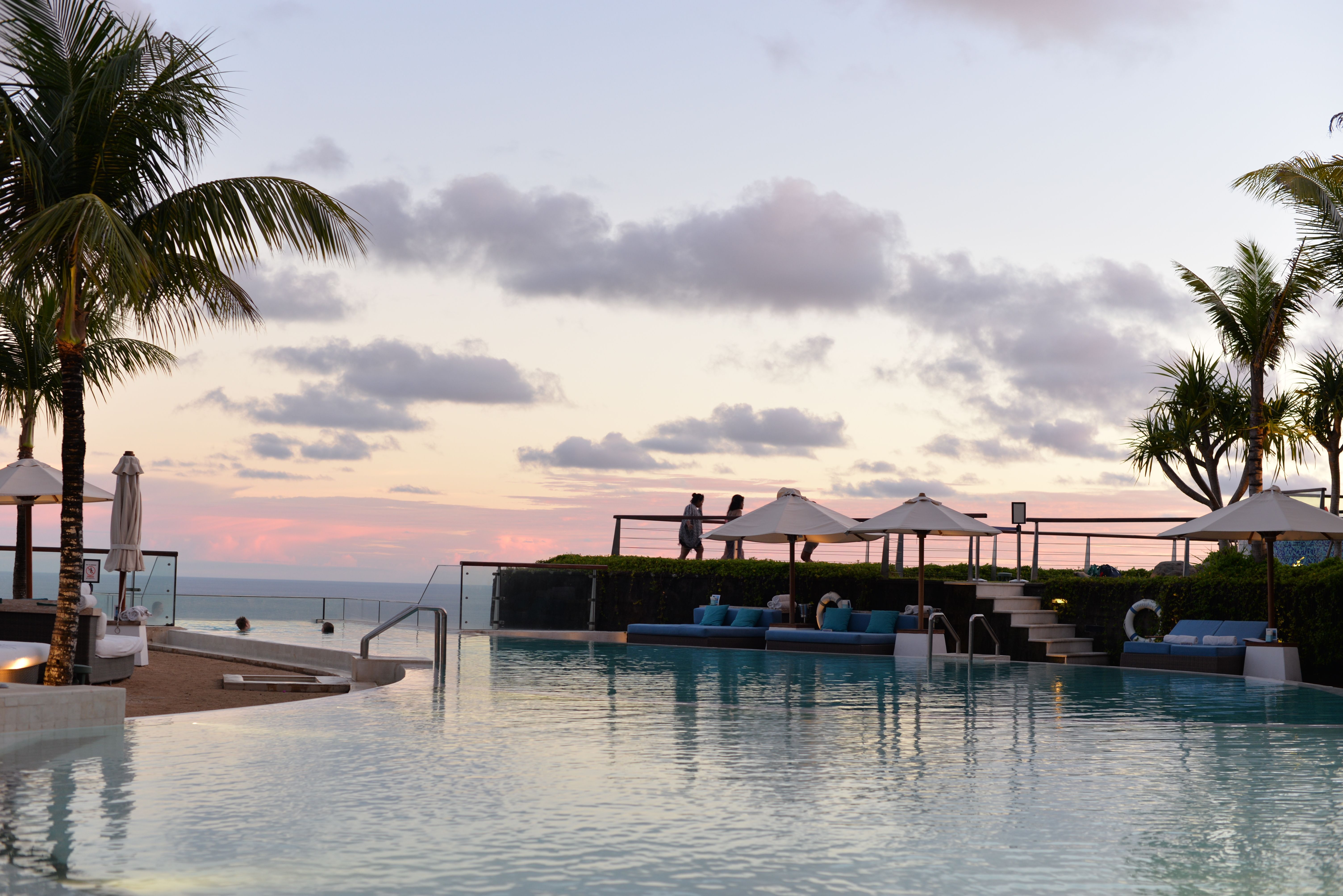 Самые красивые виды на закат открываются из ресторана клуба, который расположен в круглом фантастическом здании из бамбука. Вокруг бассейна – деревья в саду отеля и вид на океан между деревьев. Однако этого вида достаточно, чтобы понять, стоит ли идти штурмовать волны на Легиан бич или лучше переждать время в штиле бассейна.