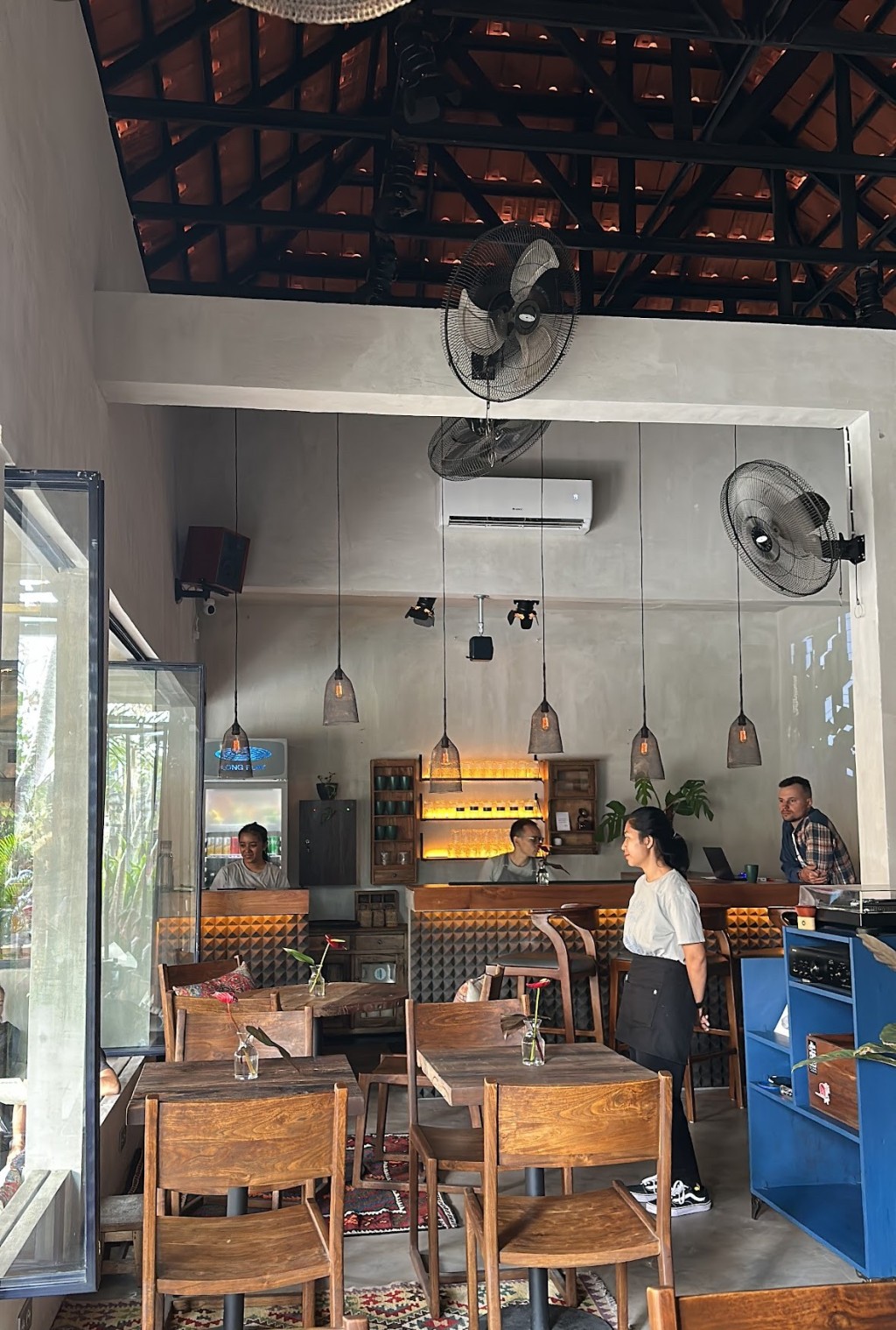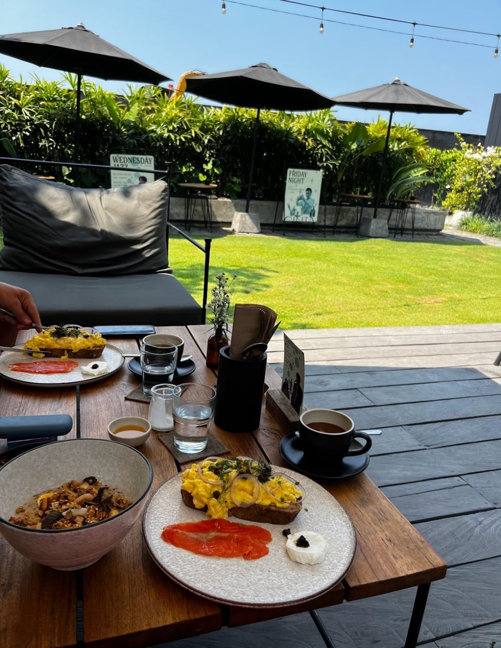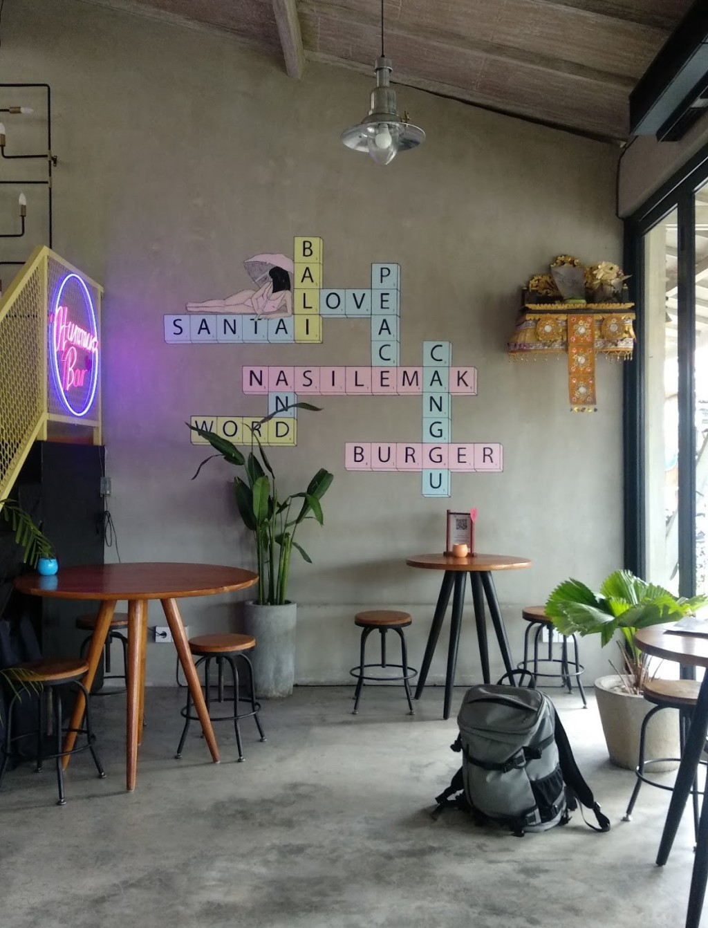 Уютное кафе в балийском стиле. Раф-кофе здесь имеет цитрусовый вкус, но к сожалению напиток оказался водянистым с горьким кофейным привкусом.