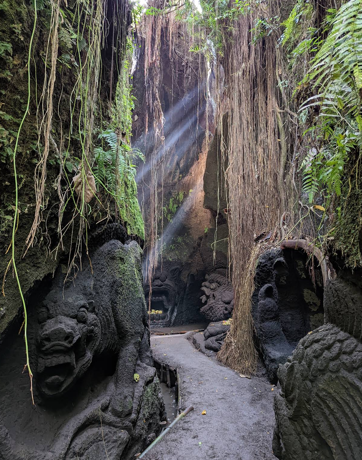 Это магическое место располагается в деревне Punggul, недалеко от района Пенестанан на Бали. Вокруг зелёные холмы, рисовые террасы, тропинки, украшенные резными фигурами богов и демонов.