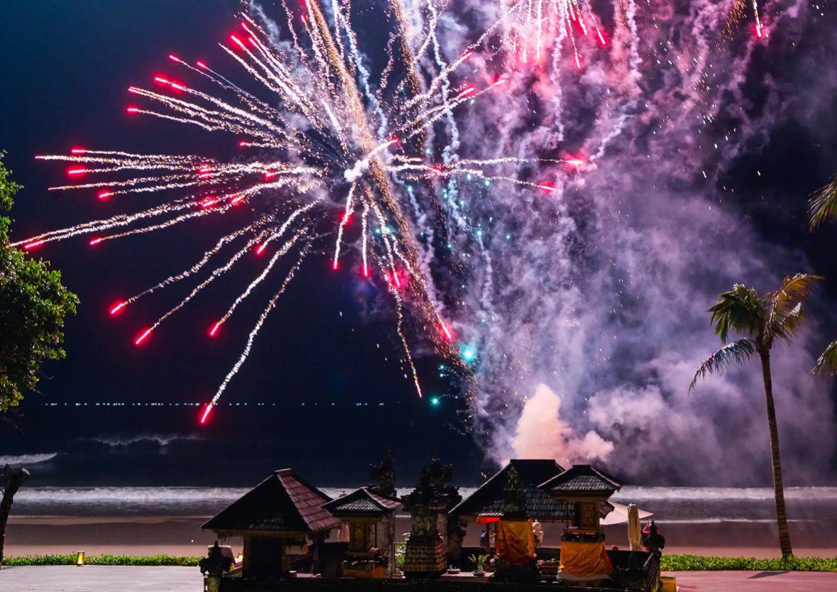 В новогоднюю ночь Бали превращается в один большой фейерверк. Ровно в полночь салюты запускают по всему острову — с пляжей, отелей, баров, клубов. Это не одно централизованное шоу, а сотни огней, вспыхивающих одновременно со всех сторон.