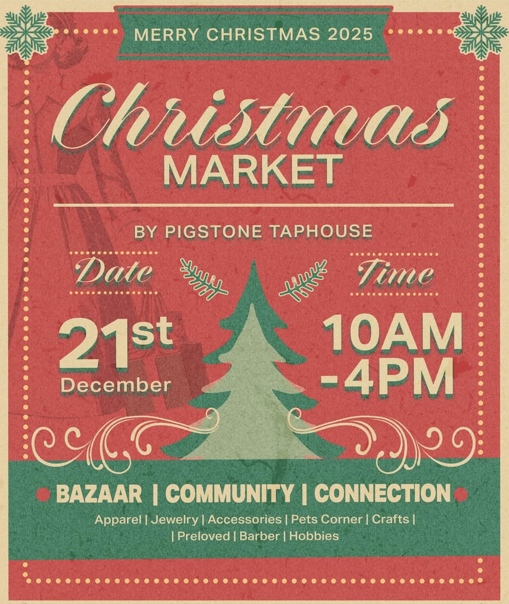 Рождественская ярмарка в Pigstone Taphouse с локальными брендами, одеждой, украшениями, аксессуарами, изделиями ручной работы и зоной для домашних питомцев. Атмосфера комьюнити и неспешного декабрьского дня.