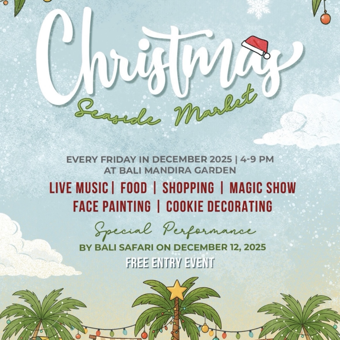 Рождественский маркет у океана на территории Bali Mandira: локальные бренды и ремесленники, еда, напитки, живая музыка и вечерняя праздничная атмосфера. Вход свободный.