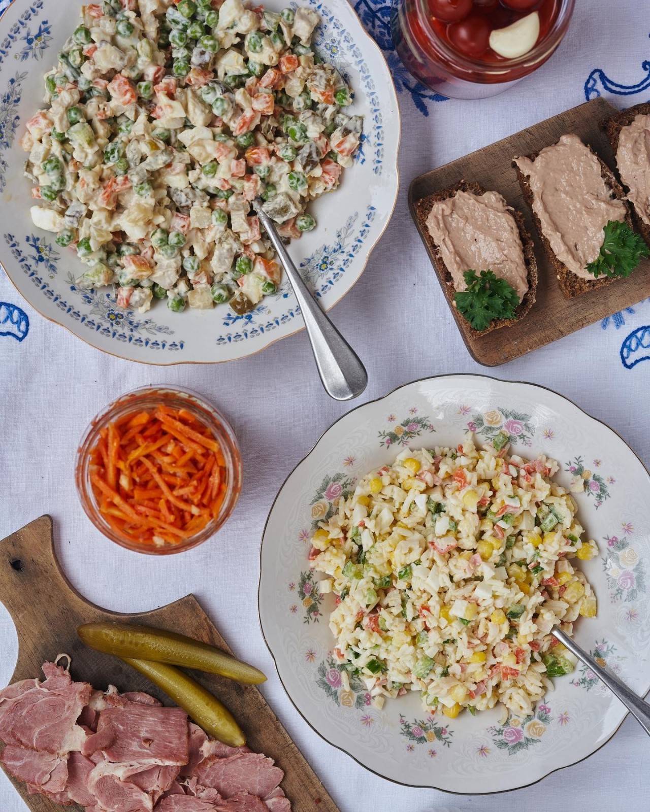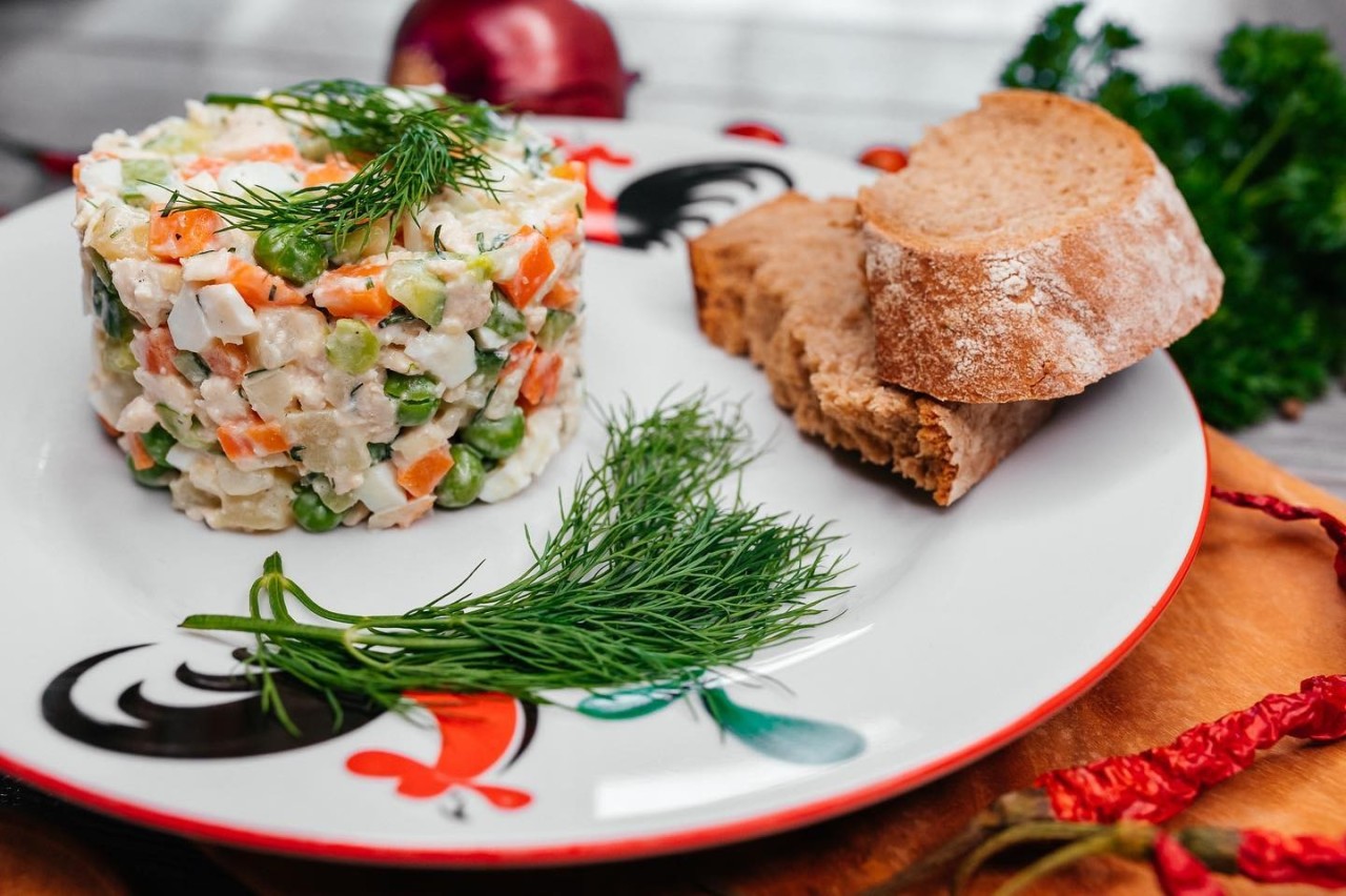 Салат оливье нам не зашел, кисловатый привкус майонеза сбивал с толку, соленые огурцы были не аппетитными. По ощущению, салату несколько дней.