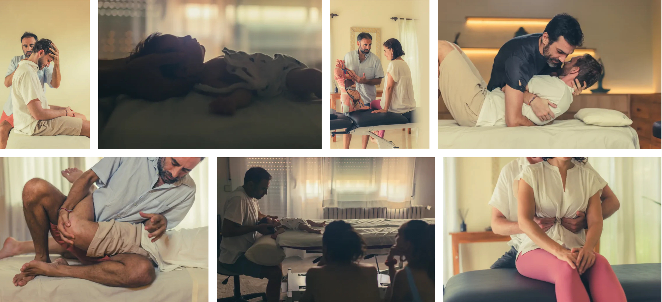 Работает со взрослыми, детьми, спортсменами и беременными женщинами, уделяя особое внимание осанке, боли, развитию и производительности. Его сеансы подчеркивают спокойное присутствие, глубокое слушание и способность организма к самоизлечению.
