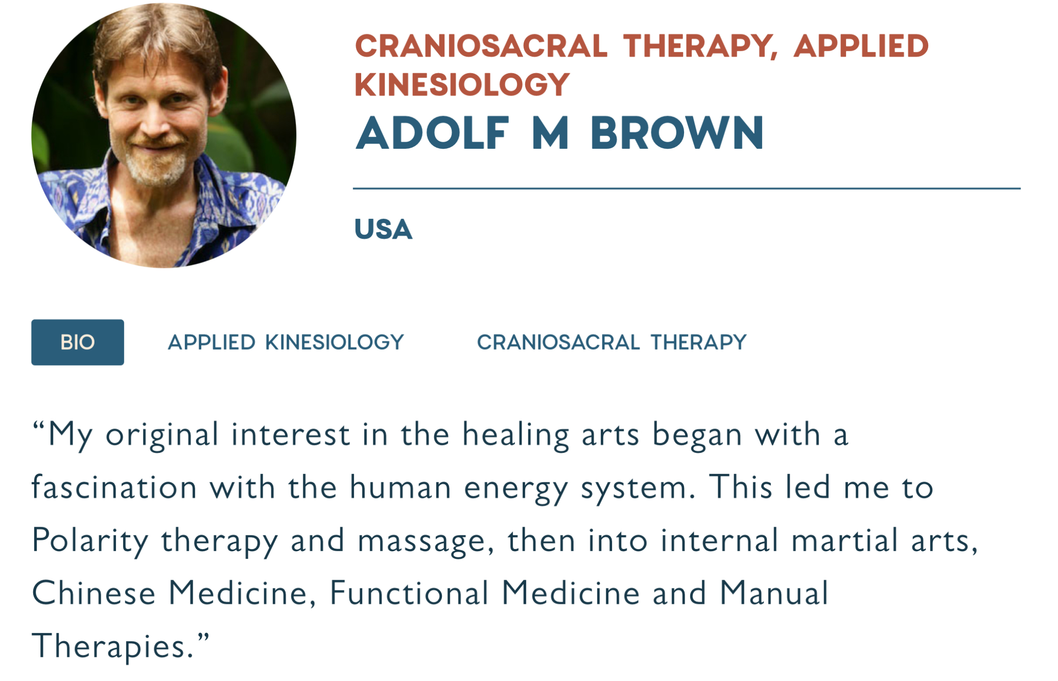 Адольф Браун - практик из Америки, который сочетает в своей работе прикладную кинезиологию и краниосакральную терапию. Его подход направлен на то, чтобы видеть здоровье человека целостно, а не сводить всё лишь к отдельным симптомам. С помощью прикладной кинезиологии он проводит мышечное тестирование, которое помогает выявить истинные причины хронических проблем, будь то боли в спине и суставах, нарушения пищеварения, снижение иммунитета, скрытые аллергии или общее чувство усталости. Такой метод словно «спрашивает» тело напрямую и помогает понять, где именно возникает дисбаланс.