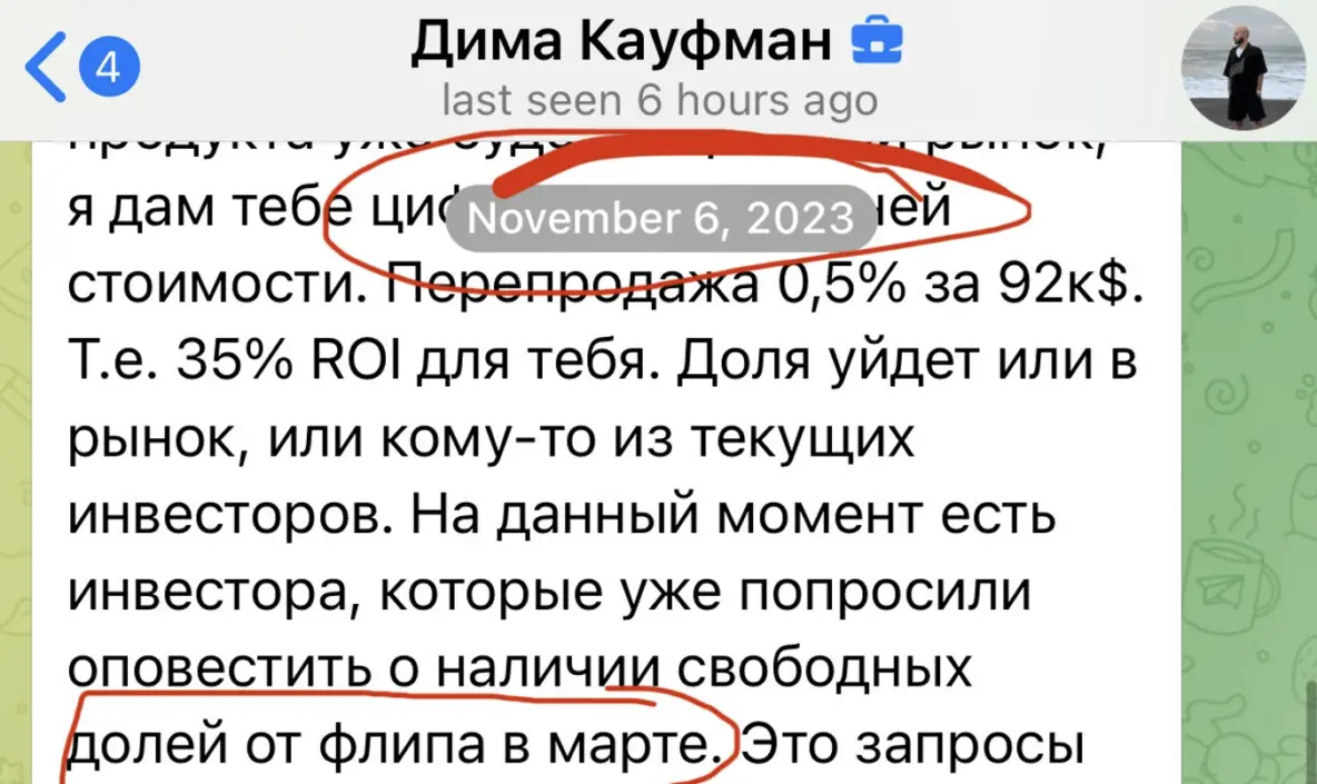 Наступил март. Менеджер как ни в чем не бывало ответил, что при выходе до 1 года никакой помощи при продаже не будет. Но проблема в том, что это не апраты или вилла. Это ДОЛЯ от проекта. И то, что доля стоит $92к - условность, которую установили в компании. То есть продать ее самостоятельно просто невозможно.