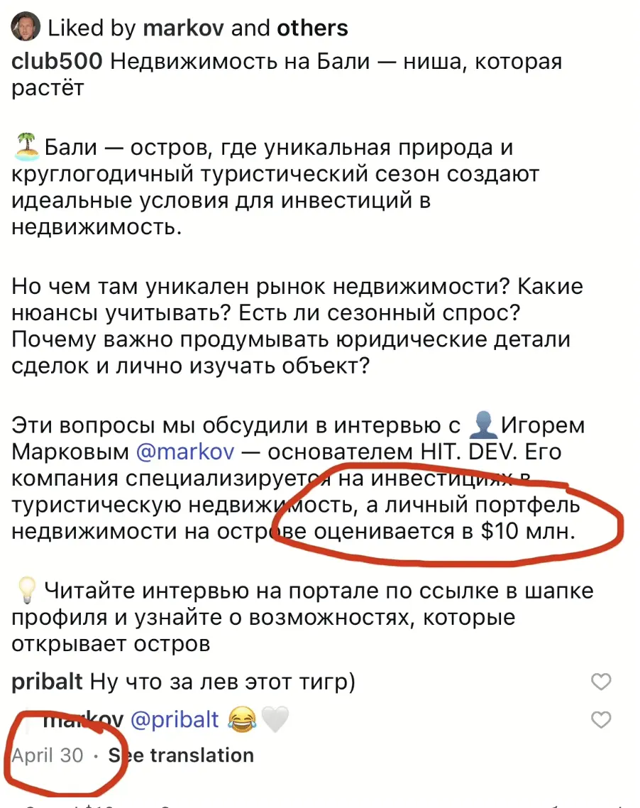При этом у Маркова на личной странице как раз 30 апреля 2025 года выходит свеженький мотивирующий пост про его активы на Бали: