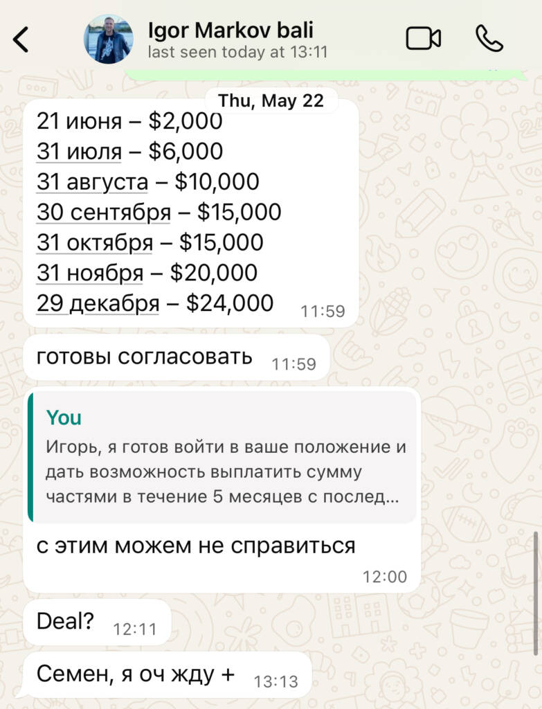 Спустя неделю после моей публикации мне позвонил Марков, чтобы договориться на новые условия. Дела в компании похоже действительно идут не очень, поэтому я решил снова уступить и предложил рассрочку.
