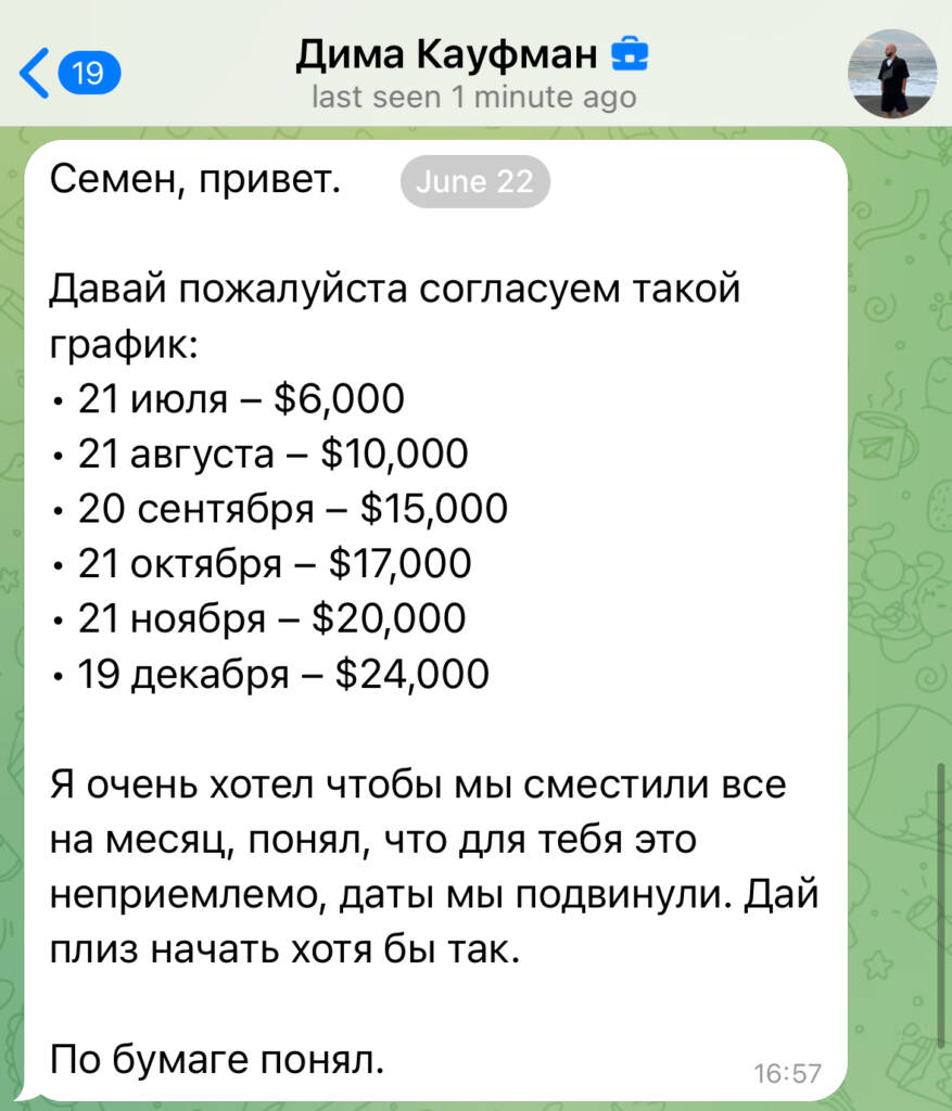 Я согласился, но попросил перейти в юридическое поле. Да, деловая переписка имеет силу, и нужно отдать должное, что Кауфман не удаляет и не изменяет ее. Это давало мне надежду, что они и правда не хотят скамить, а просто забуксовали. Однако я все же решил перенести договоренности на бумагу. За это я буду готов получать выплаты с июля.