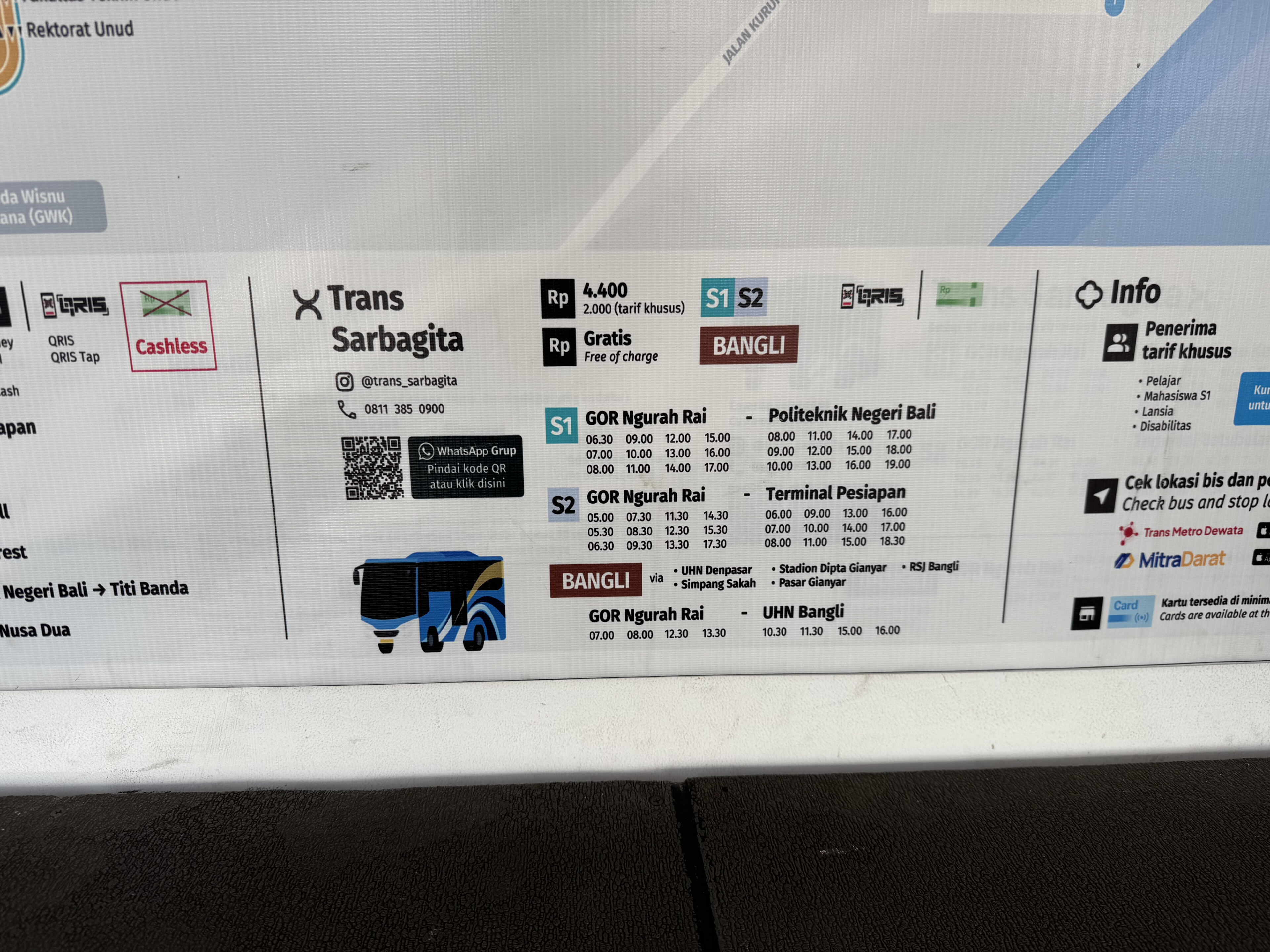 Есть инстаграм компании, где можно проверить расписание, правда, он только на индонезийском. У Сарбагиты есть три маршрута или коридора. Коридор 1 начинается от центрального стадиона в Денпасаре и заканчивается в ГВК (Гаруда Вишну Кенчана парк) на Буките. Коридор 2 также стартует от центрального стадиона в Денпасаре и заканчивается в Нуса Дуа. Третий коридор доставит вас из Денпасара в Бангли (там, где Кинтамани) и обратно. Расписание прилагается ниже. В первом графике сверху - будни, во втором ниже - выходные и праздники.
