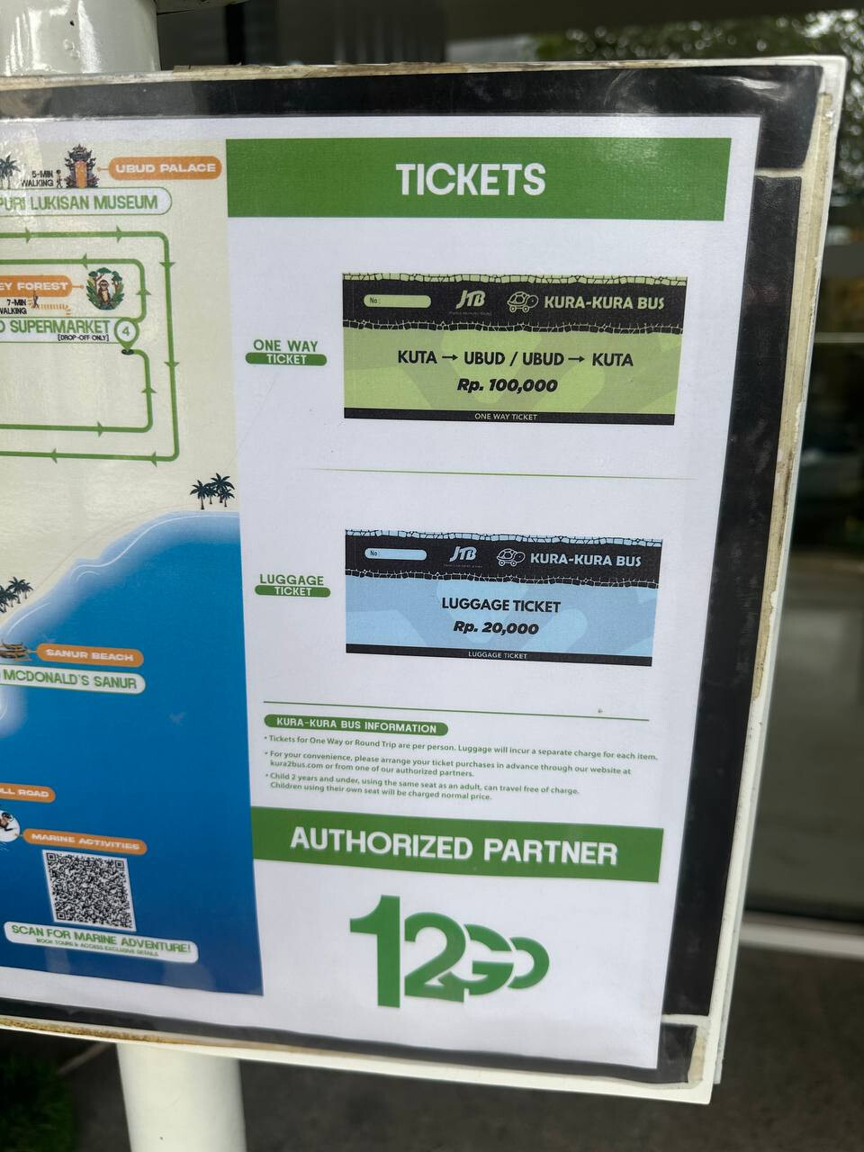 Стоимость проезда из Куты в Убуд и из Убуда в Куту составит 100 000 рупий за пассажира. Если вы берете билет туда и обратно - 160 000 рупий. Дети до 2-х лет бесплатно. Багаж оплачивается отдельно - 20 000 рупий. Автобусы работают с 8 утра до 7 вечера.