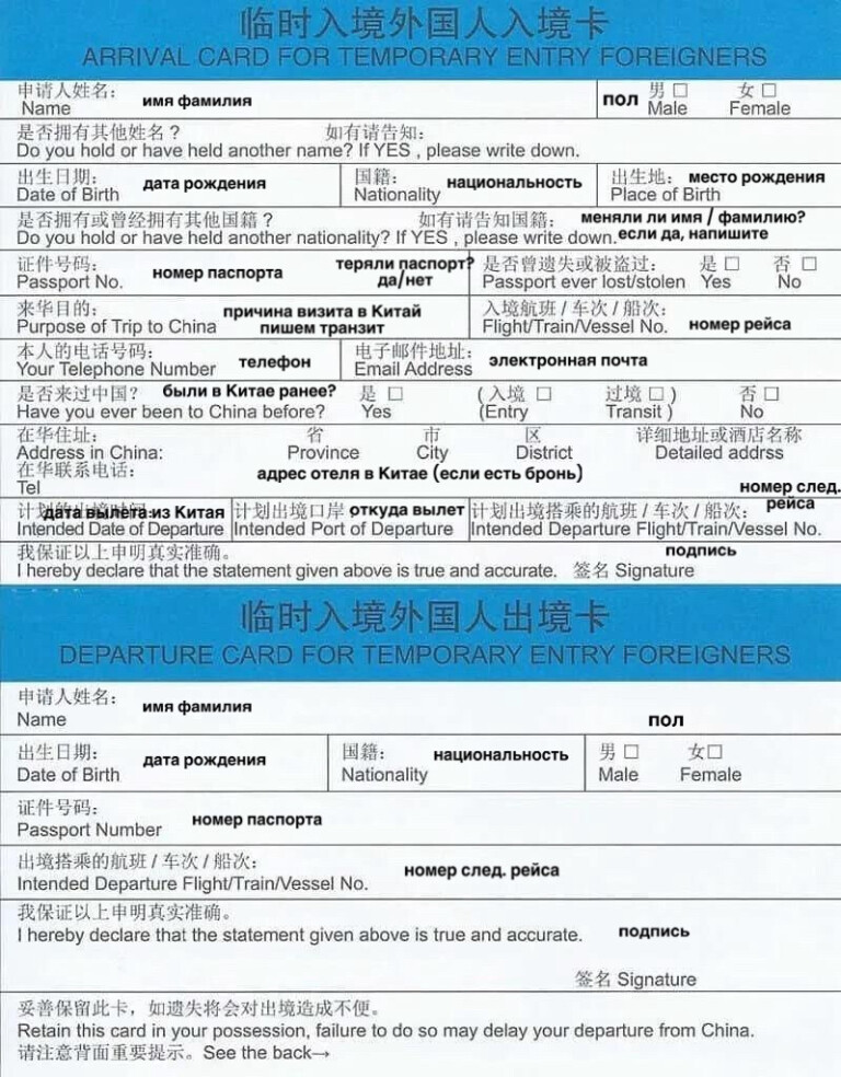 Вам необходимо заполнить arrival card for temporary entry — карту прибытия для временного въезда в Китай. Стенд с белыми бланками с синей каймой находится перед паспортным контролем.