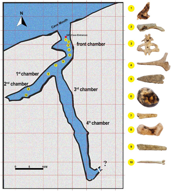 Ученые нашли в пещере окаменевшие останки позвоночных животных (кости мамонтов, черепах, оленей), а также острые каменные орудия, похожие на наконечники стрел или копий, которые с высокой вероятностью были изготовлены человеком. Это подтверждает, что люди использовали эту территорию в доисторический период.