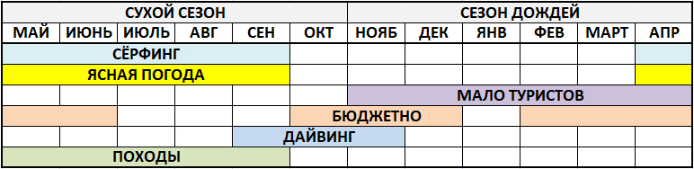 Если вы планируете ежегодный семейный отпуск, свадьбу или медовый месяц на Бали, крайне важно все спланировать соответствующим образом. Определить оптимальное для себя время посещения Бали можно на основании таблицы: