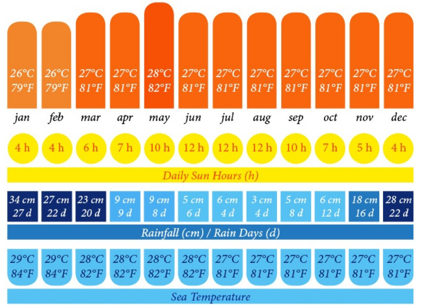 Сезон дождей по-настоящему начинается в декабре, когда ливни и грозы становятся более частыми и обильными. Температура воздуха достаточно высокая, но из-за частой облачности и дождей жара не сильно ощущается. Дожди и океан очень теплые. Иногда возможен сильный штормовой ветер и волны. Ближе к Новому году дожди будут все чаще.