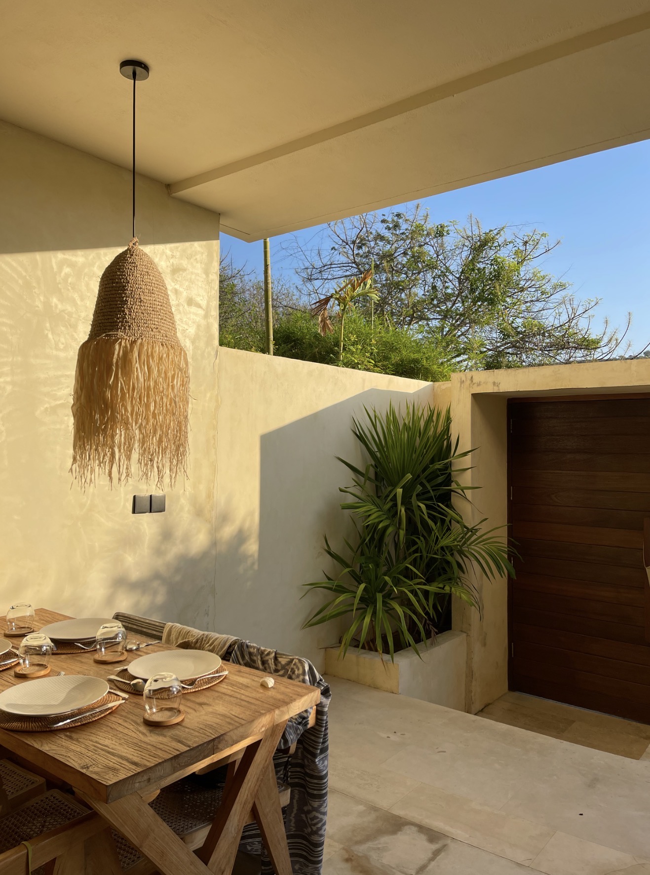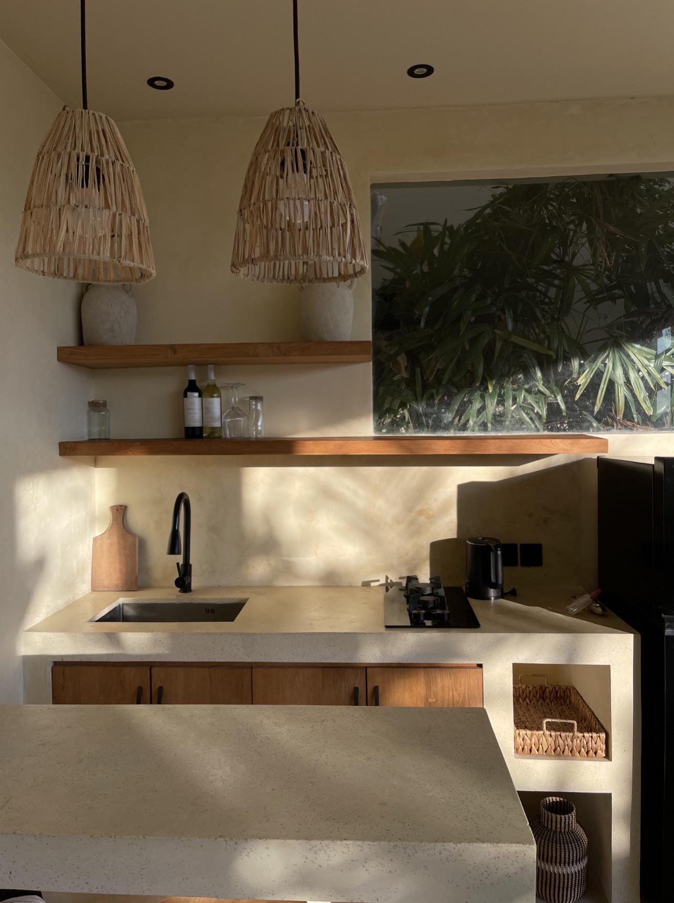 Внутри очень солнечно и стильно, все из бетона, прекрасно сочетается с зелёной растительностью. Бонусом предоставляют фрукты.