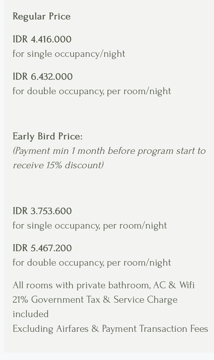 Стоимость начинается от 3 800 000 IDR за ночь при одноместном размещении в отдельном бунгало.