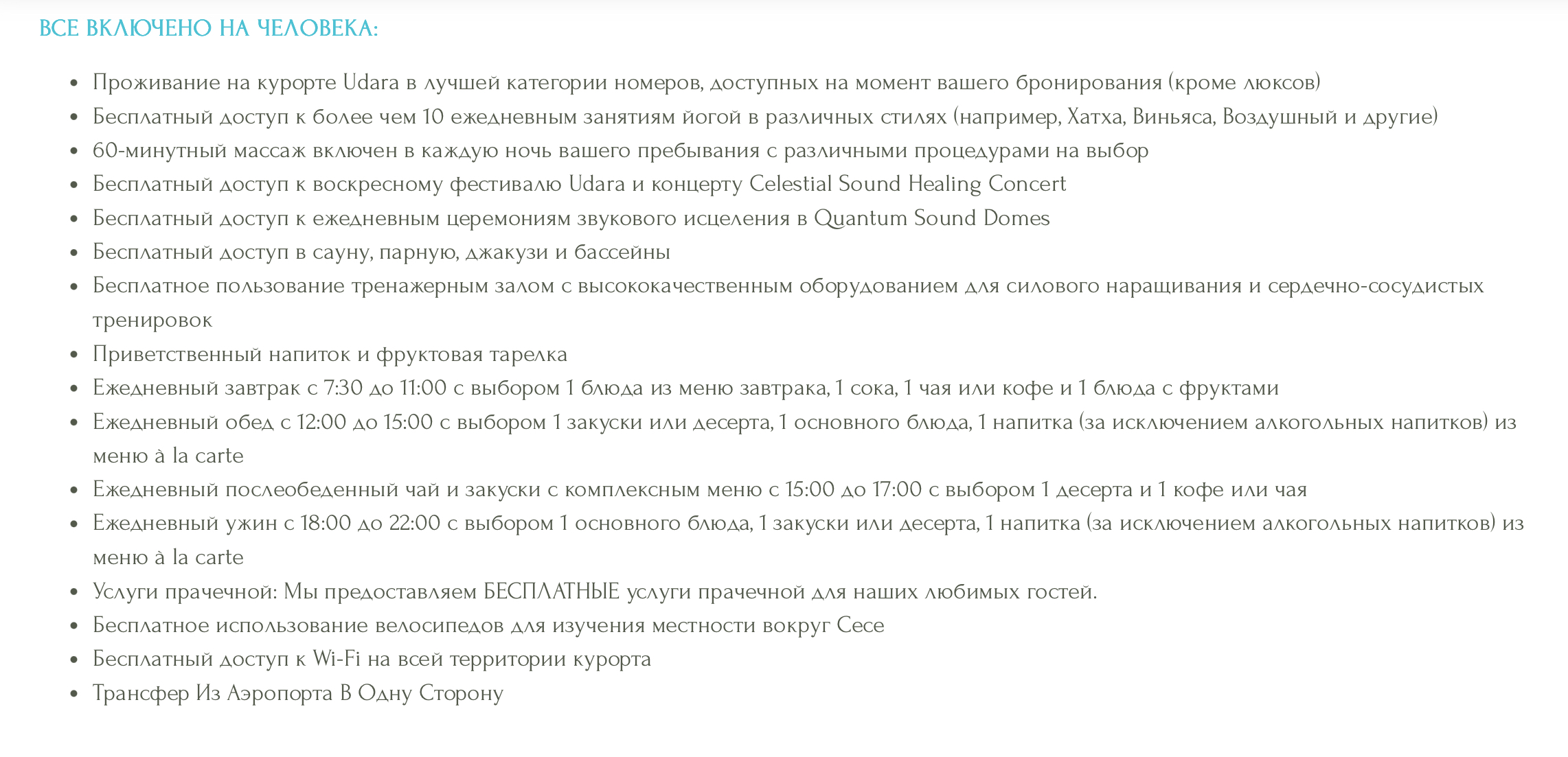 - Система распорядка: «дневной пропуск» (Day Pass) автоматически включает питание и участие во всех программах Стоимость: ~$47 USD. Проживание начинается от 40 до 90$ за ночь.