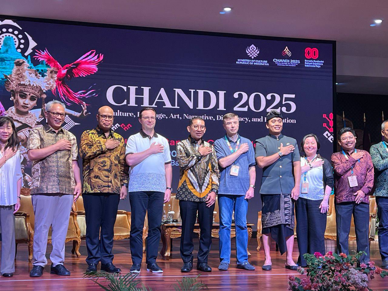 Министр культуры Индонезии Фадли Зон официально закрыл международную культурную конференцию CHANDI 2025 (Culture, Heritage, Arts, Narrative, Diplomacy and Innovation), прошедшую с 3 по 5 сентября на Бали. В форуме приняли участие представители более чем 35 стран, включая Россию, Армению, Грузию, Беларусь и Узбекистан. В числе участников — министры, послы, эксперты, художники и деятели культуры.