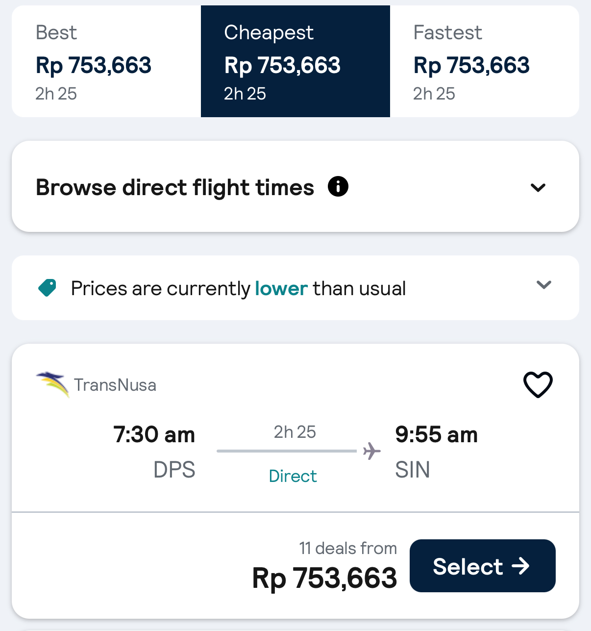 Обратный рейс из Сингапура (SIN) в Денпасар (DPS) отправляется в 10:55 по местному времени.